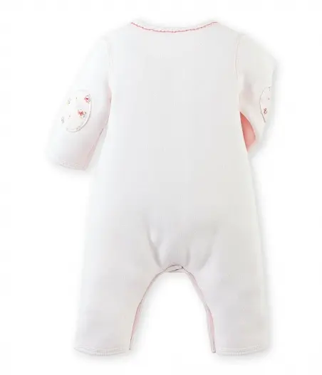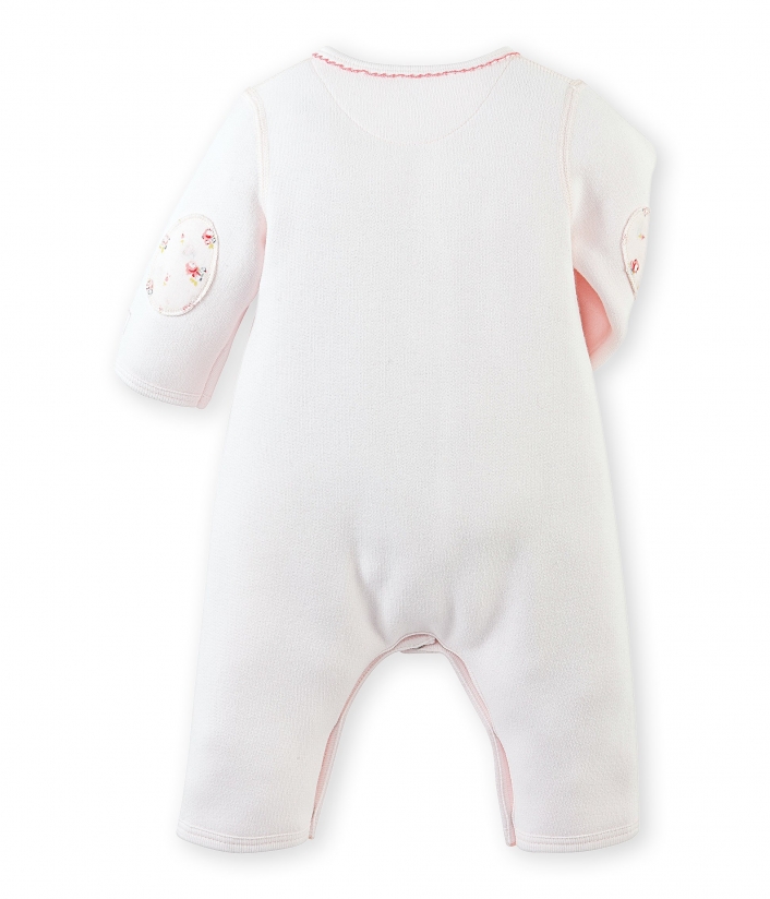 Комбінезон з відкритими ніжками для дівчинки, виготовлений з теплого флісу. Комбінезон прикрашений прекрасними деталями: оздоблення вирізу в стилі піко, накладки на ліктях з квітковим принтом, елегантний пасок-бантик. Комбінезон оздоблений зручною системою застібок, що зроблять переодягання малечі швидким та легким. Дуже комфортний одяг для денної прогулянки. Матеріал: 100% бавовна.