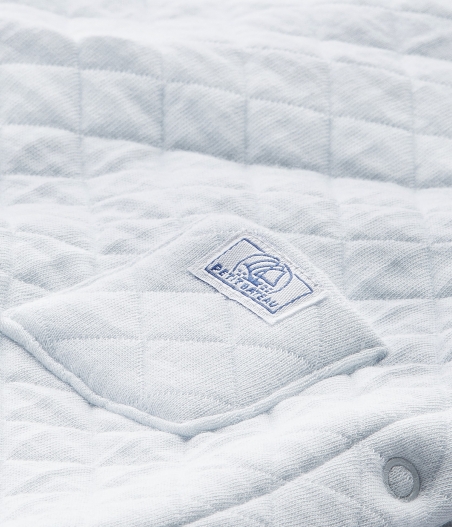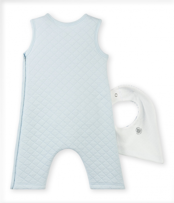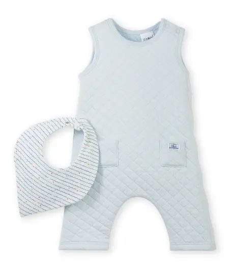 Комбінезон для хлопчика, виготовлений із стьобаної тканини. По всій довжині комбінезону розташовані зручні застібки. Комбінезон прикрашений двома маленькими кишенями. У комплекті з комбінезоном представлений слинявчик. Цей набір ідеально підійде для подарунка немовляті. Матеріал: комбінезон - 73% бавовна, 27% поліестер; слинявчик - 100% бавовна.