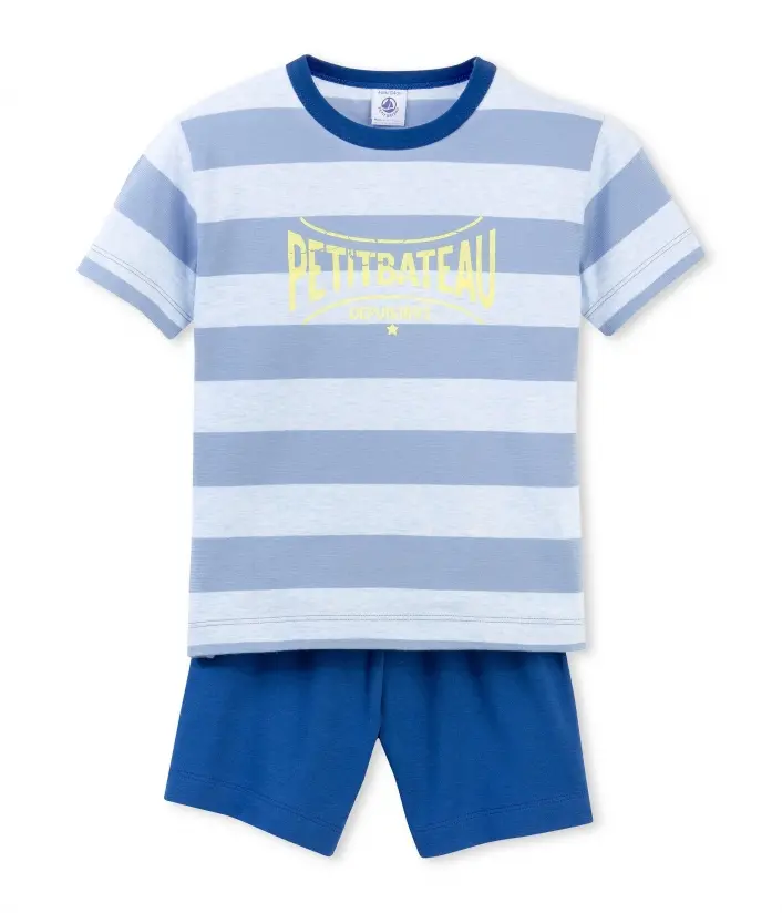 Пижама для мальчика, идеально подойдет для теплых ночей. Топ изготовлен из мягкой, эластичной ткани с широкими полосками и надписью "Petit Bateau 1893 ". Шорты однотонные. Материал: 100% хлопок.