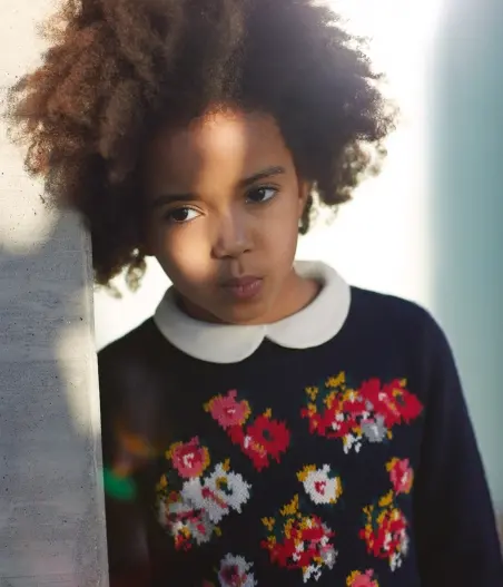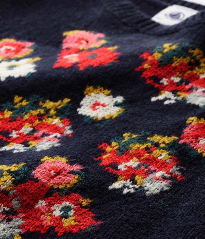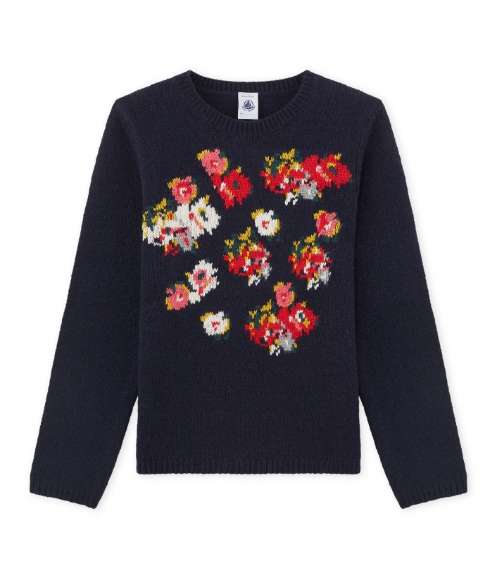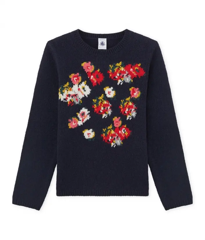Шерстяной свитер для девочки, с красивым цветочным узором. Must-have в гардеробе девочки в этом сезоне. Материал: 62% шерсть, 38% полиамид.