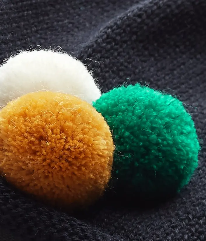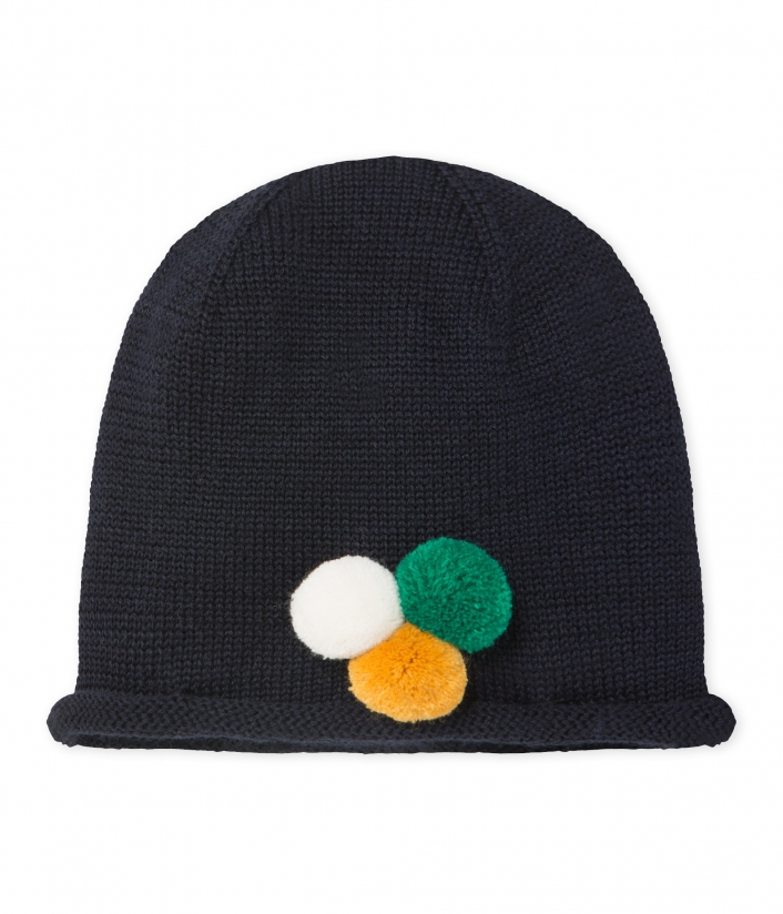 Вязаная шапка для девочки имеет элегантные детали включают в себя скрученный край и три очень маленькие цветные помпоны на боку. Этот мягкий, теплый аксессуар для ребенка идеально подходит для зимы.
