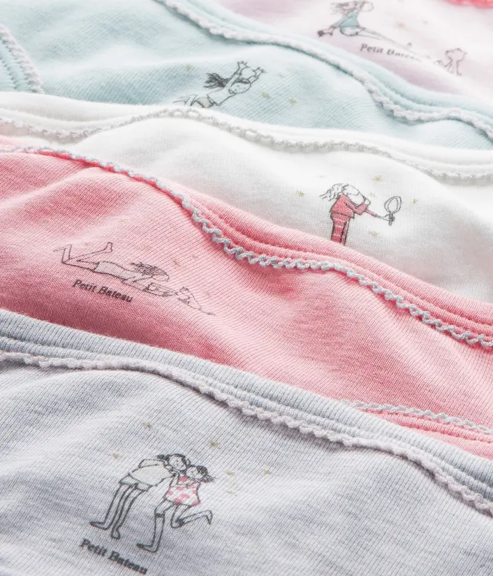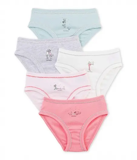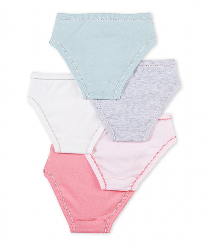 Набір з п'яти трусиків для дівчини. Кожні з трусиків представлені в пастельних тонах і прикрашені різноманітними малюнками. Матеріал: 100% бавовна.