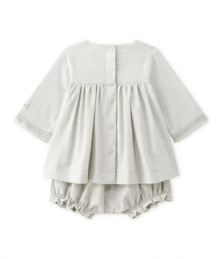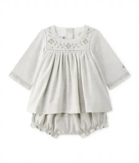 Ми просто не можемо встояти перед цією сукнею для дівчинки, виготовленою з бавовни. Сукня доповнена трусиками-панталонами з бавовняного трикотажу. Ця елегантна сукня оздоблена візерунком на грудях. Практичні застібки на спинці полегшують одягання дитини. Ідеальний дитячий наряд для особливих днів! Склад: 100% бавовна.