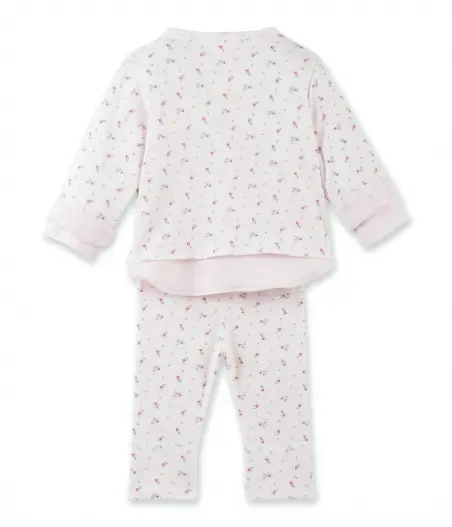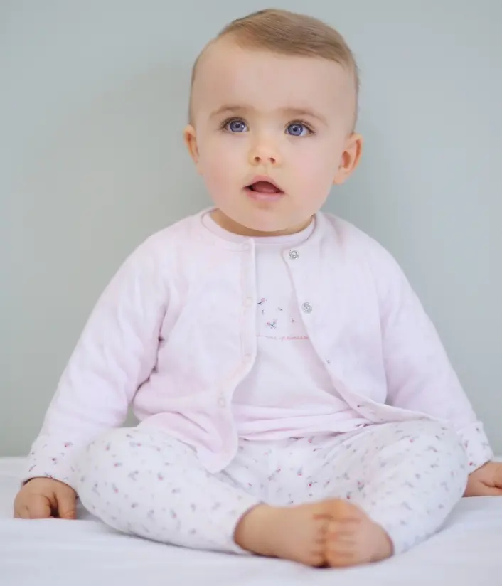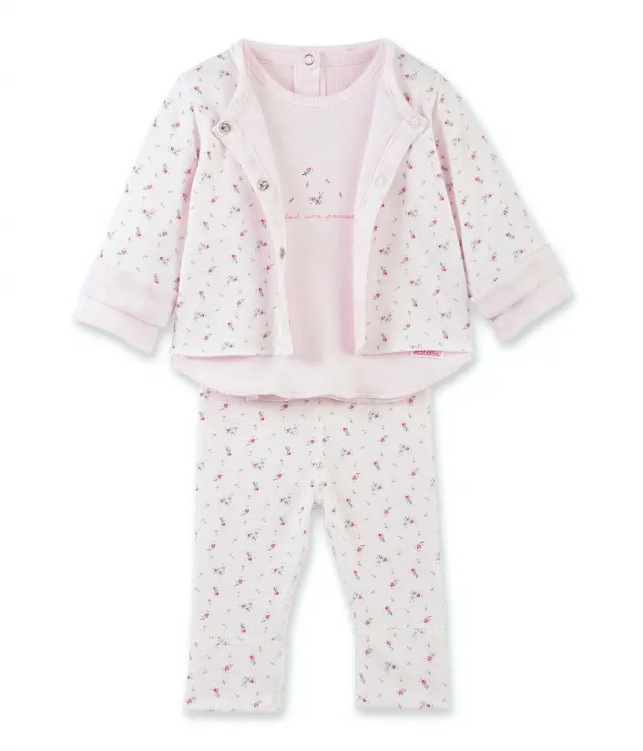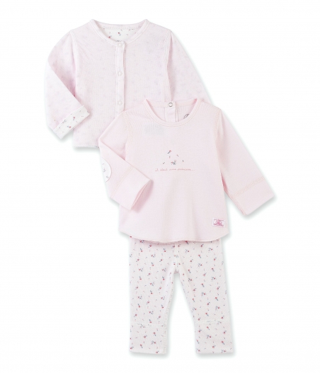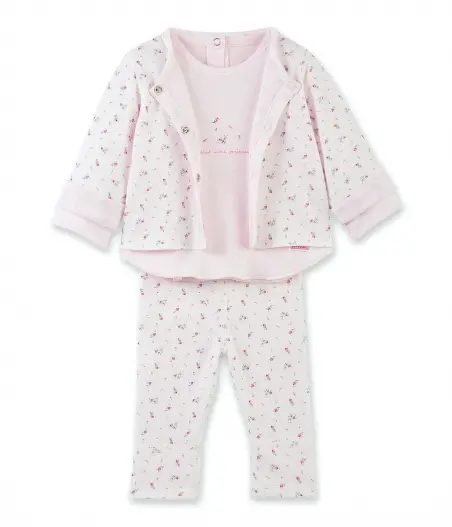 Неймовірний набір для дівчинки, до якого входить двосторонній кардиган, простора футболка з довгими рукавами і штанці. Кардиган і футболка мають зручні застібки-кнопки. Штанці дуже комфортні, завдяки еластичному поясу. Цей набір стане ідеальним подарунком для новонародженої дівчинки. Матеріал: 100% бавовна.