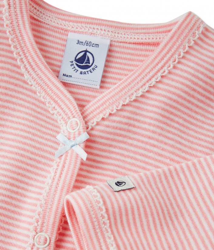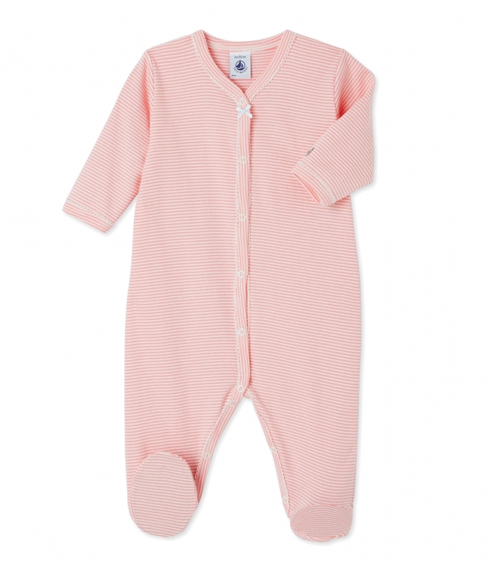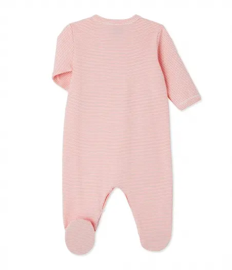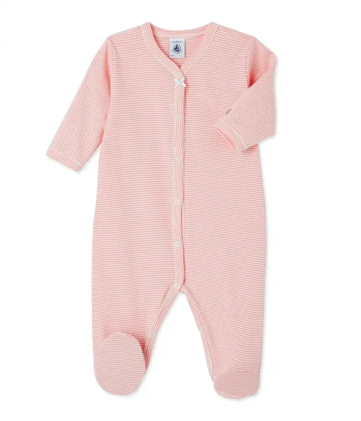Смугаста піжама для немовлят від Petit Bateau. Піжама виготовлена з бавовни чарівного рожевого кольору. Піжама має зручні застібками між ніжками, які зроблять процес перевдягання малечі комфортним та швидким.