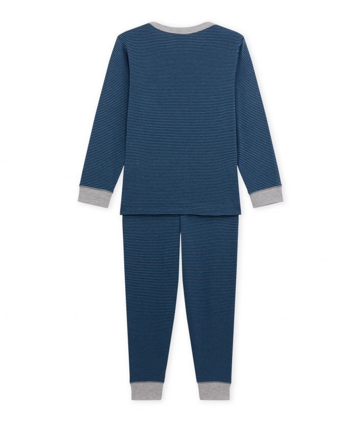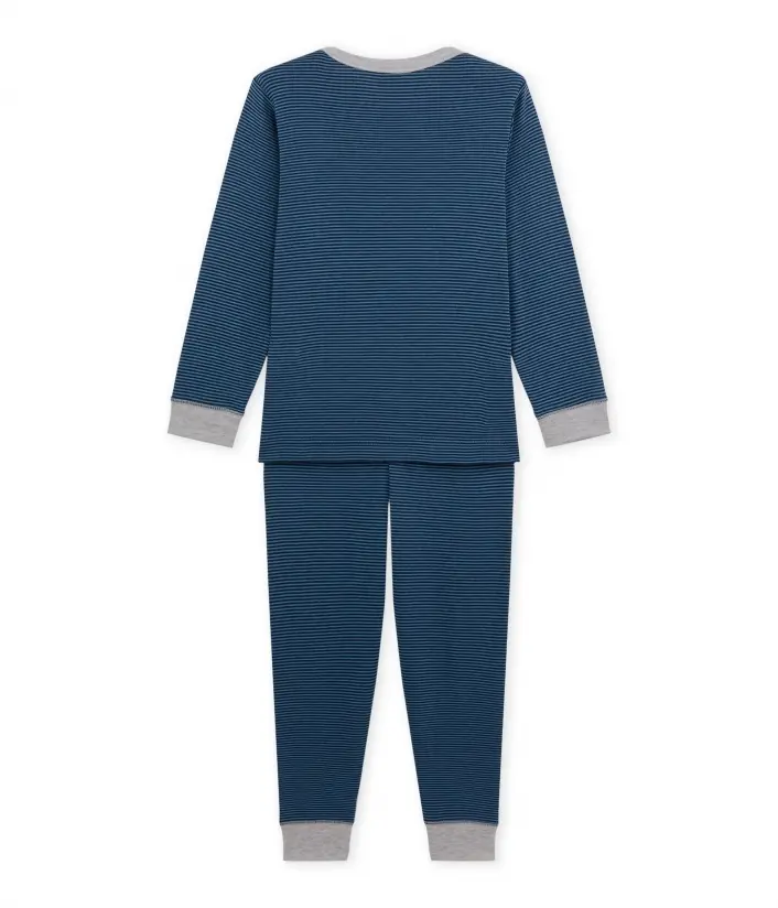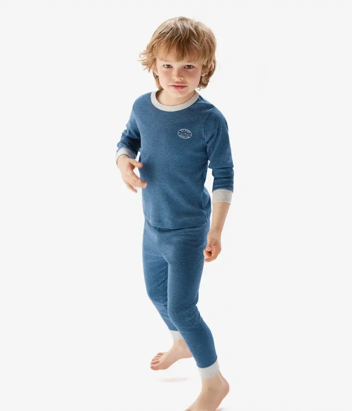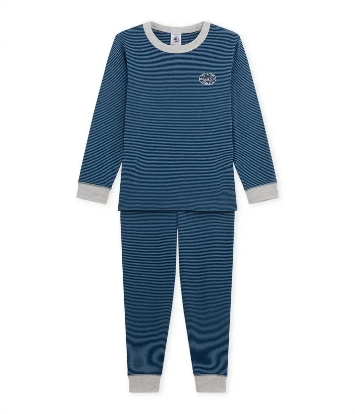 Ви не сможете встояти перед цією чудовою піжамою для хлопчиків. Виготовлена піжама з 100% бавовни. Футболка та брюки прикрашені традиційними смужками Patit Bateau. Піжама представлена в двох кольорах.