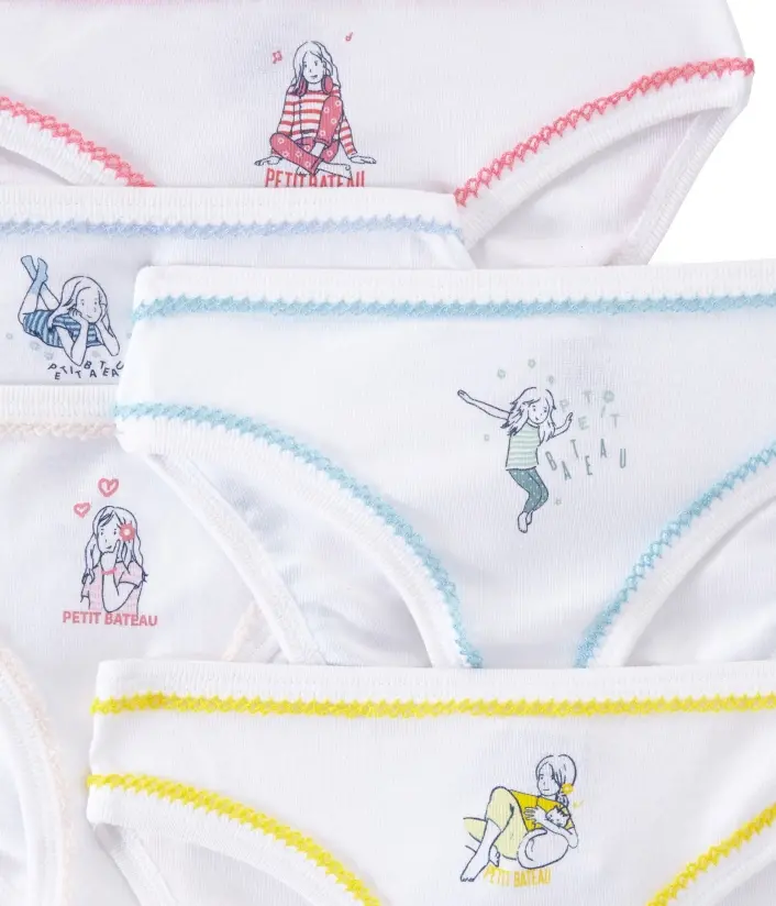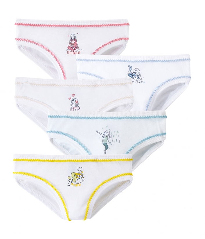 Набір з п'яти трусиків. Дитячі труси виготовлені зі 100% бавовни. Прикрашені стильними та незвичними малюнками з маленькими дівчатами. По краю трусики декоровані оборкою яскравого кольору.