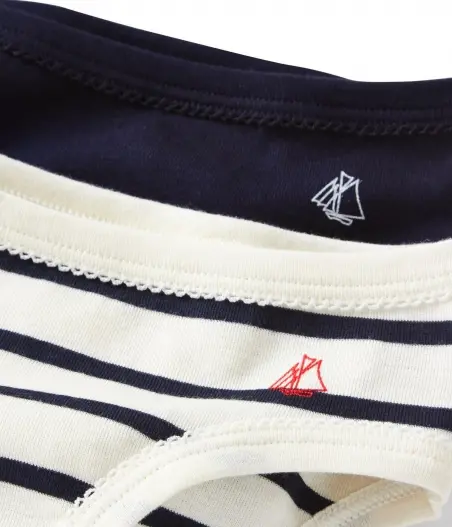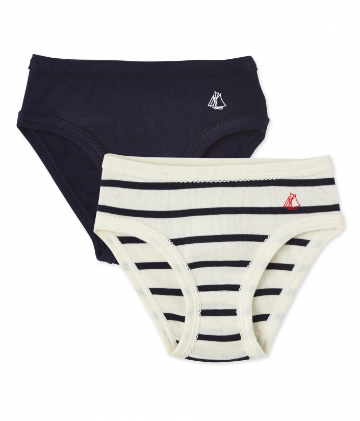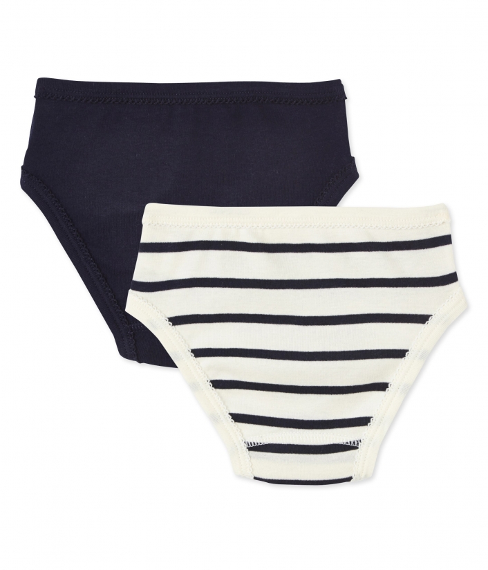 Набор из двух трусиков для девочки: одни трусики изготовлены из однотонной ткани, другие - из ткани в полоску. Материал: 100% хлопок.
