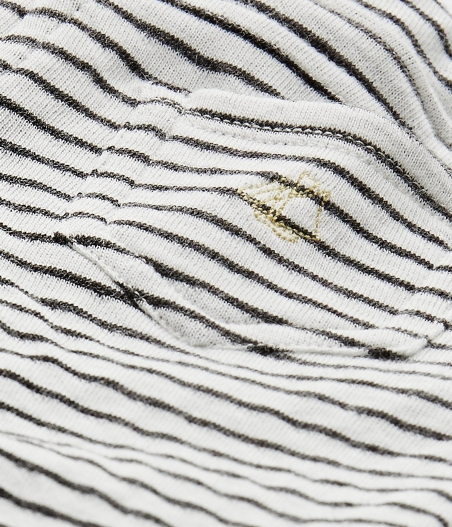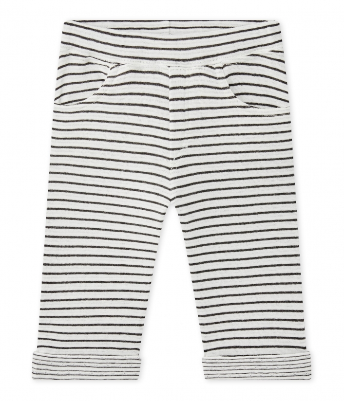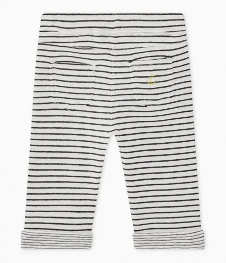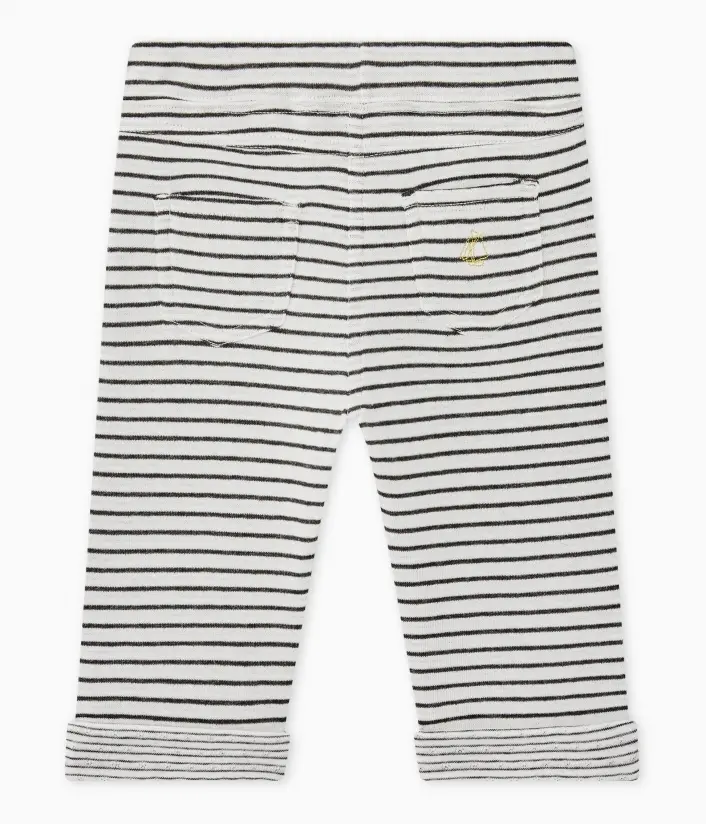 Брюки для хлопчика з кишенями. Вони мають матроські смуги молочно-чорного кольору. Склад: 100% бавовна.