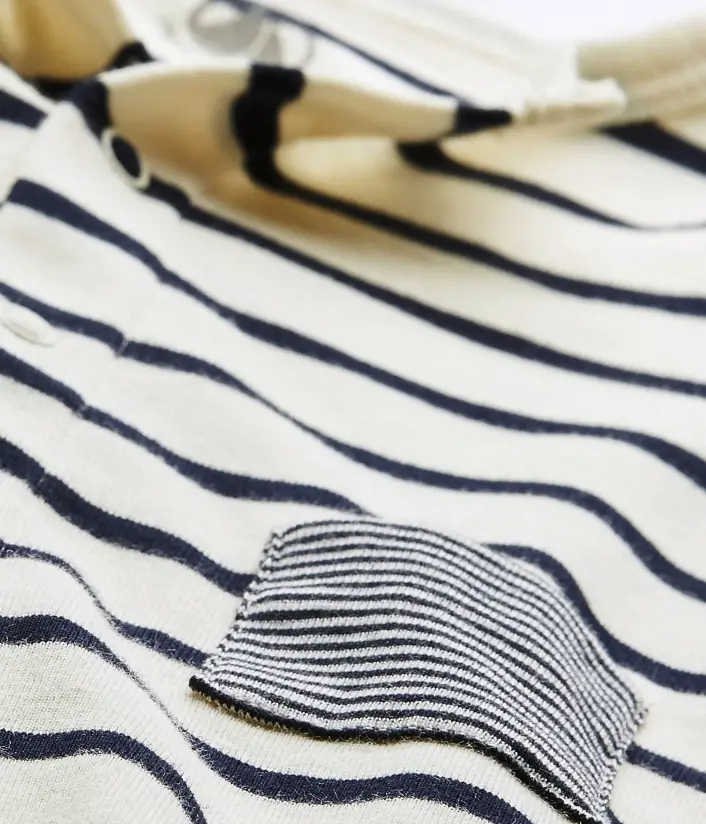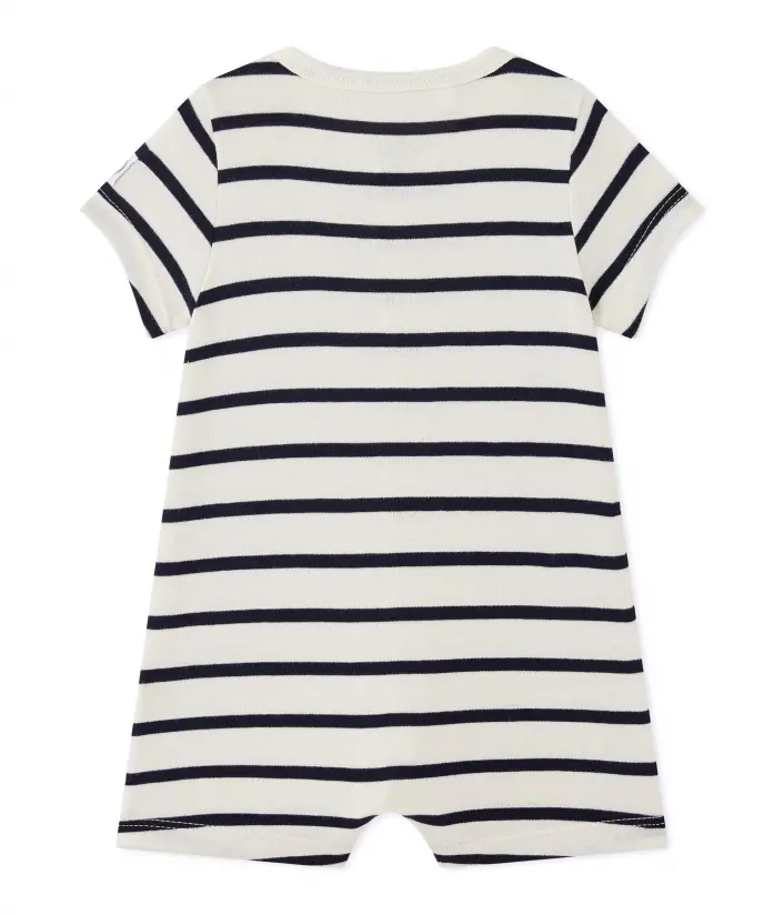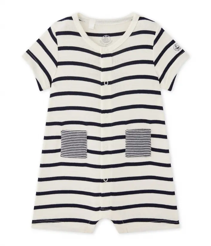 Комбінезон для немовляти з короткими рукавами виготовлений зі 100% бавовни у морську смужку, прикрашений двома накладними кишенями. Комбінезон має зручні застібки для швидкого та зручного переодягання.