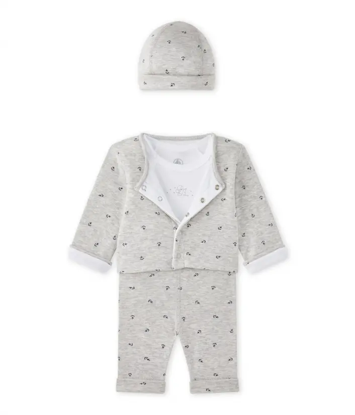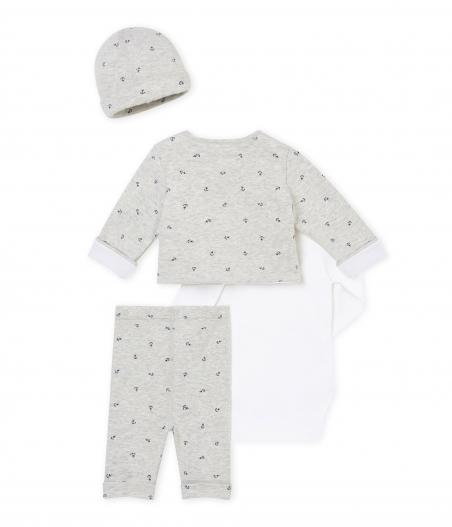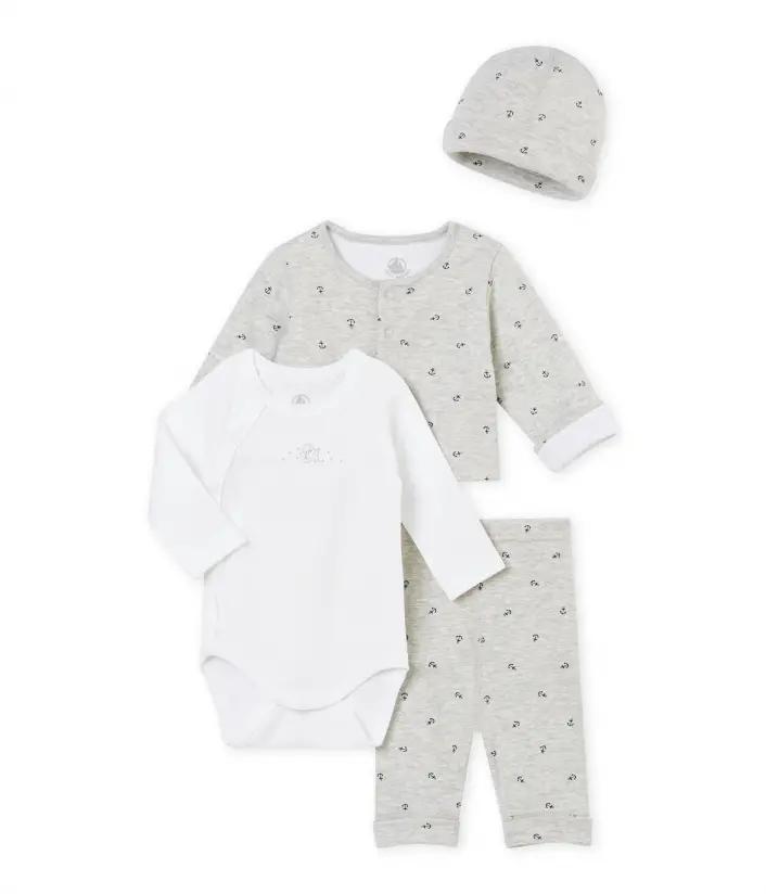 Набор для мальчика состоит из кардиганы, боди, брюк и шапочки. Кардиган с длинными рукавами застегивается на кнопки. Брюки удобные и комфортные, так как имеют эластичных пояс. Боди имеет удобные застежки между ножек. Идеально подойдет для подарка новорожденным. Состав: 100% хлопок.
