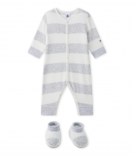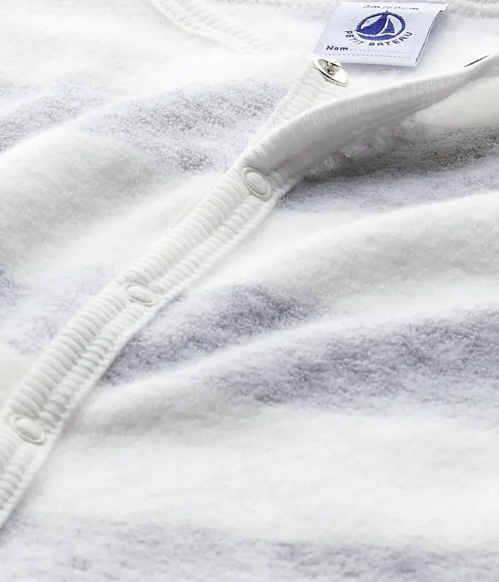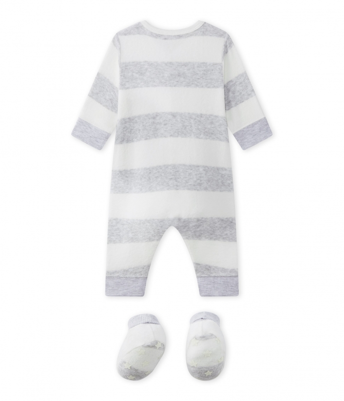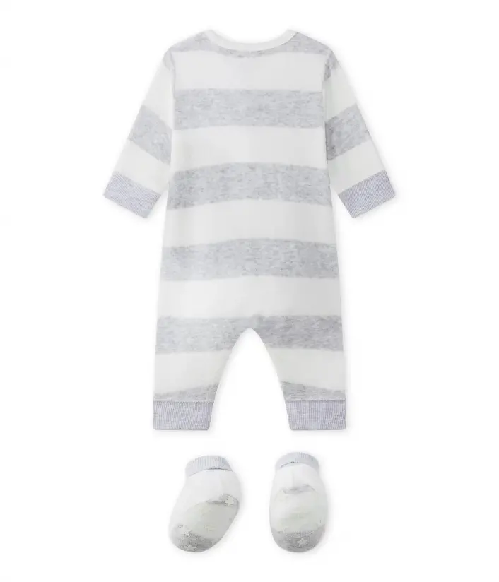 Ніжний махровий комбінезон з пінетками для хлопчика, без сумніву, сподобається малюку не менш ніж його батькам. Його дизайн виконаний в теплих тонах у смужку. Комбінезон застібається спереду на кнопки для зручності. Пінетки легко одягаються. Підошва прикрашена зірочками.