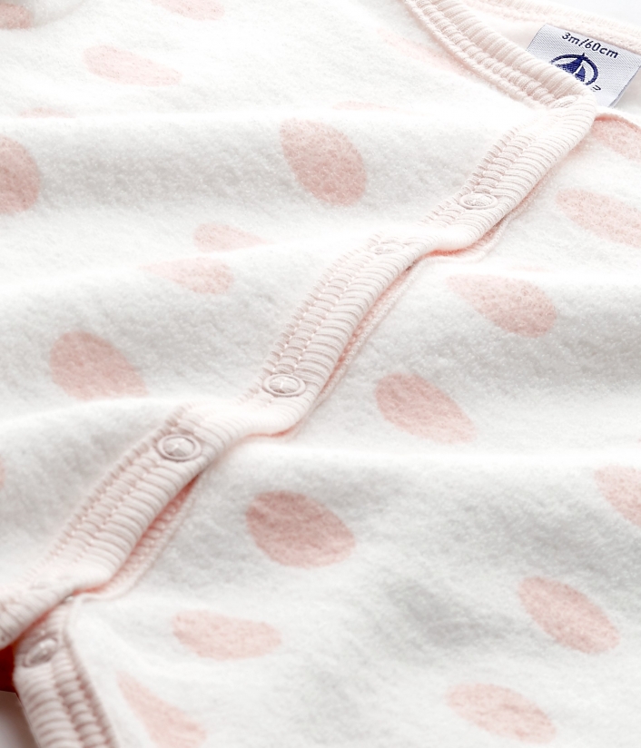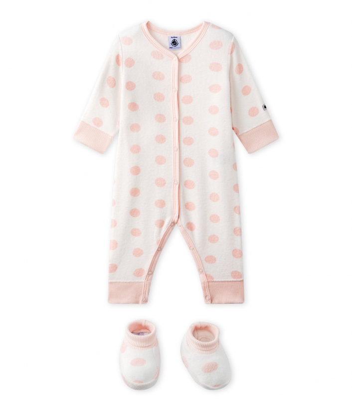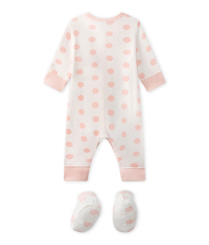 Ніжний махровий комбінезон з пінетками для дівчинки. Його дизайн виконаний в теплих тонах у рожеві кружечки. Комбінезон застібається спереду на кнопки для зручності. Пінетки легко одягаються. Підошва прикрашена зірочками.