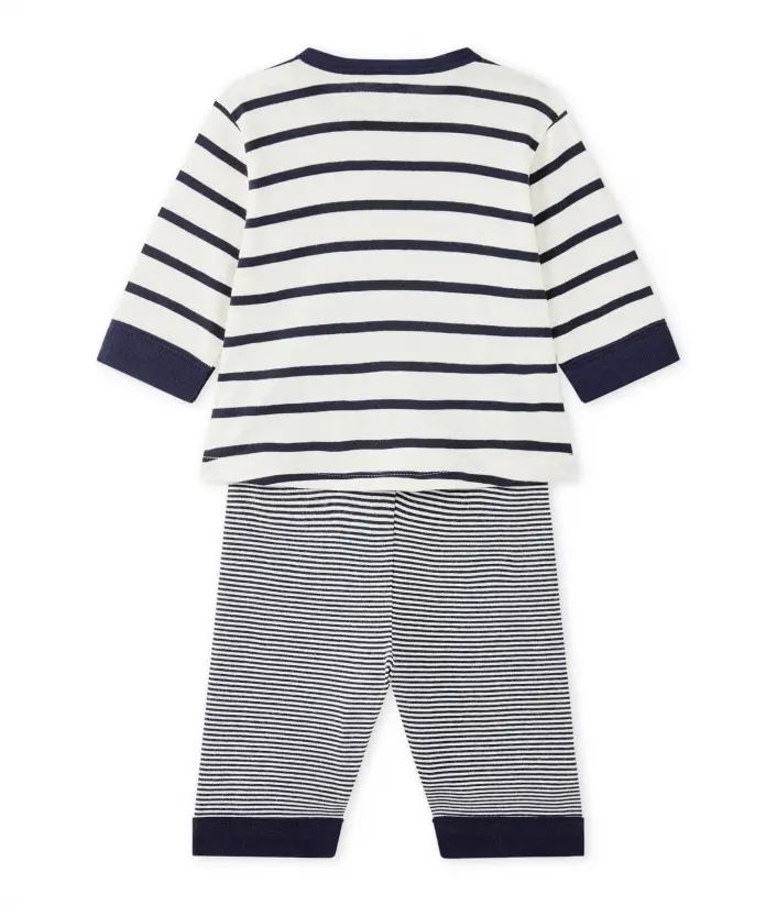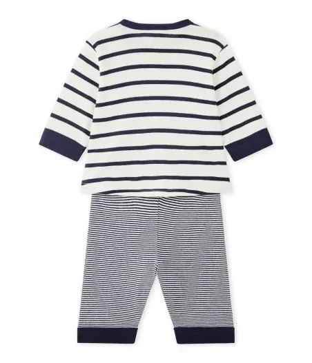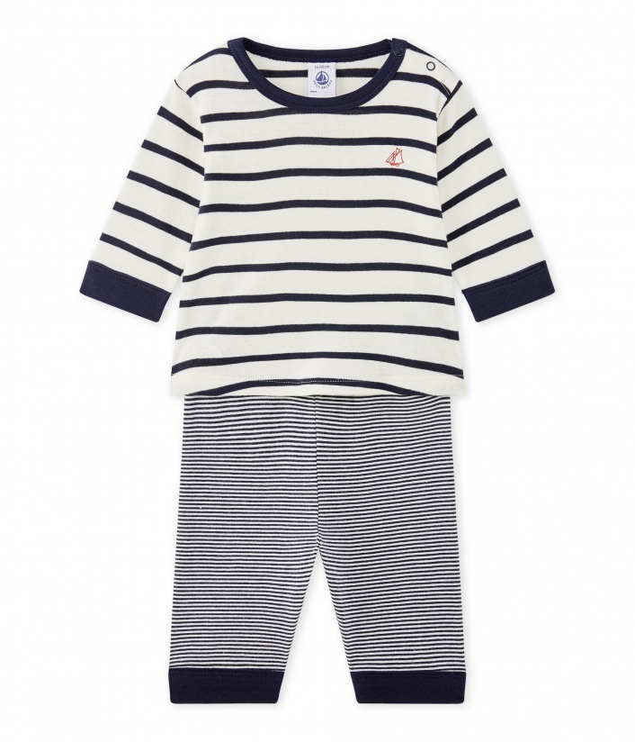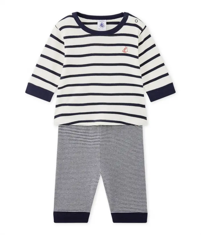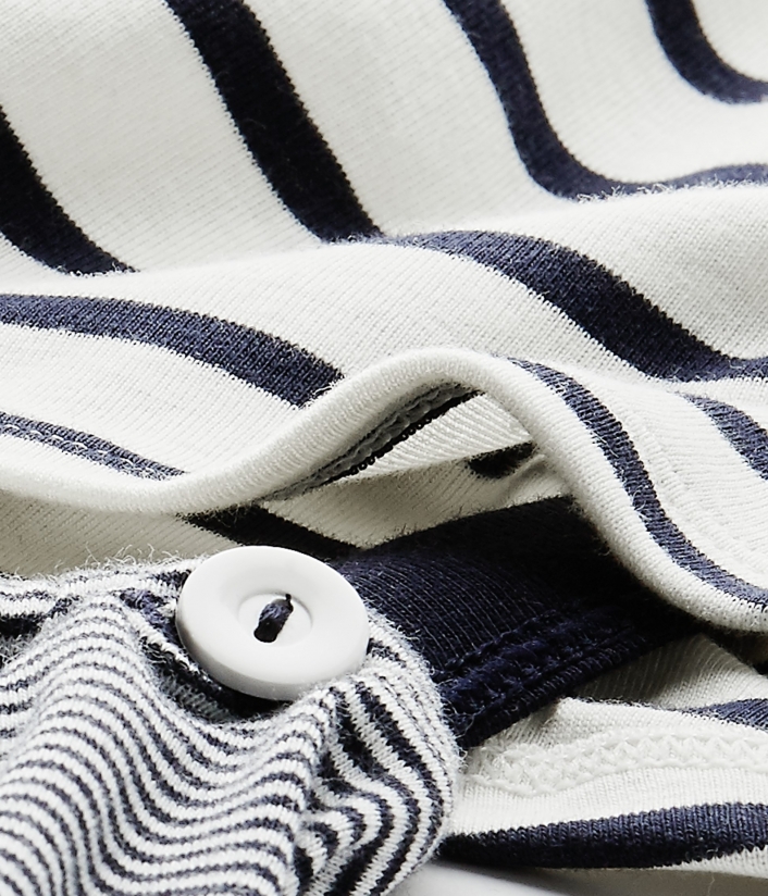 Піжама для хлопчика у смужку. На плечі дві кнопки для зручності одягання. Кофтинка та брюки з’єднуються ґудзиком для захисту дитини від протягу. Піжами Petit Bateau призначені для комфорту вашої дитини. Склад: 100% бавовна.