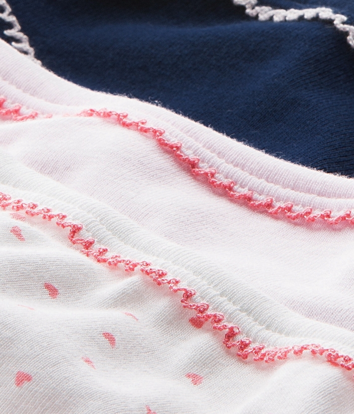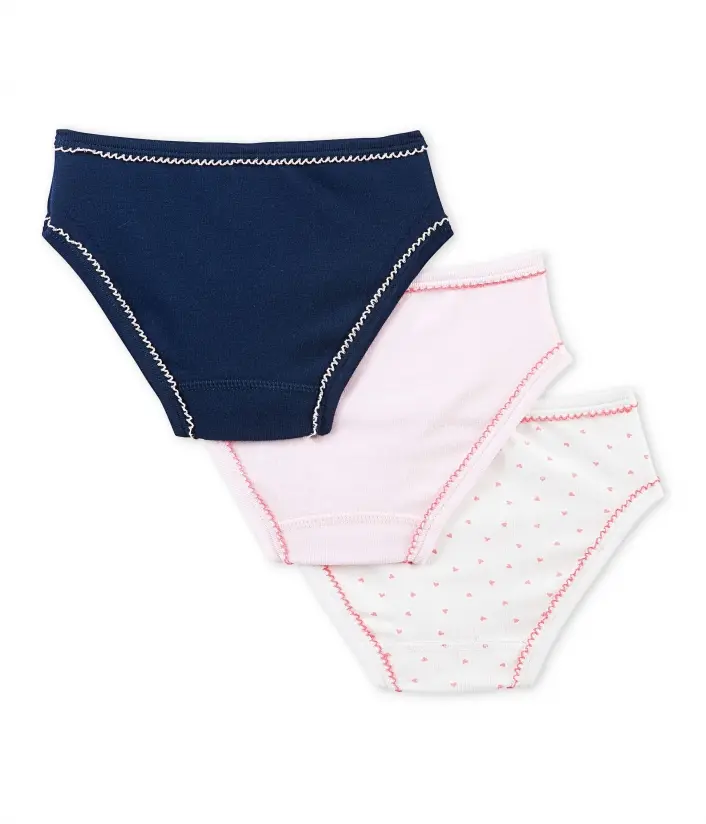 Набор из трех хлопковых трусиков для девочки: двух однотонных и одних с розовыми сердечками. Обратите внимание на обработку швов в стиле "пико". Материал: 100% хлопок.