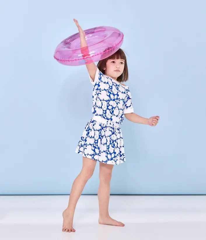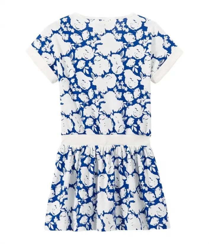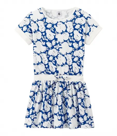 Сукня у квіточки для дівчинки з еластичним поясом із зав'язками. Виготовлена сукня зі 100% бавовни та декорована кнопками на плечі. Має спортивний та в той же час елегантний вигляд.