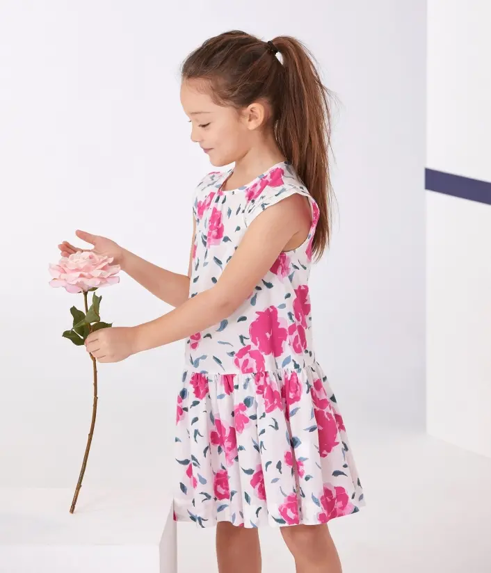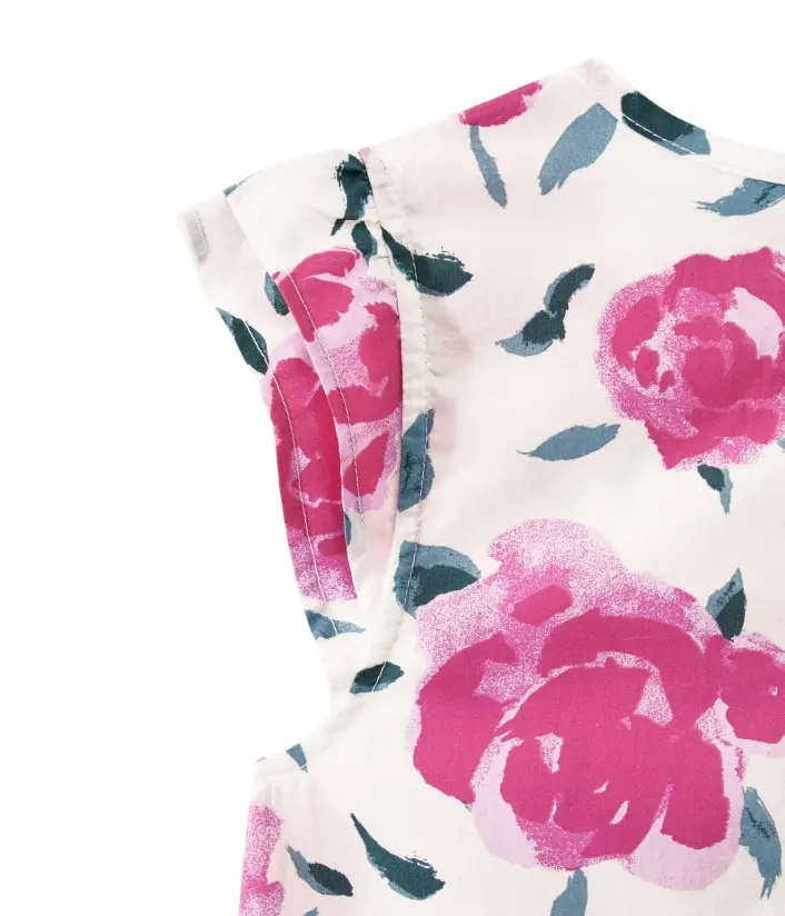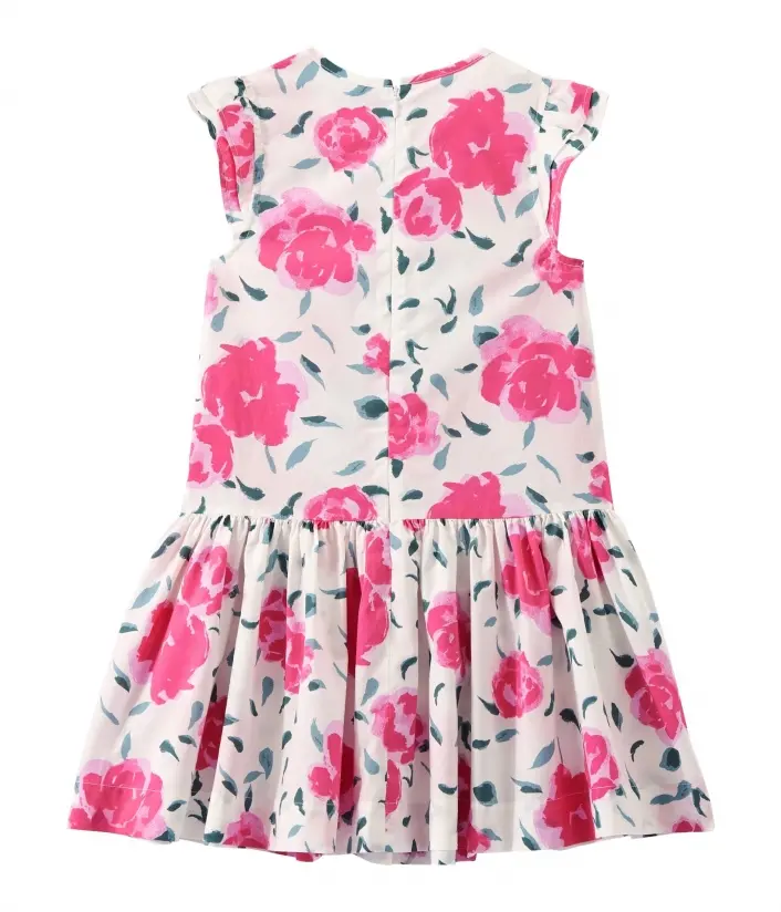 Сукня з попліну з яскравим квітковим принтом. Застібається на блискавку на спині. Склад: 100% бавовна.