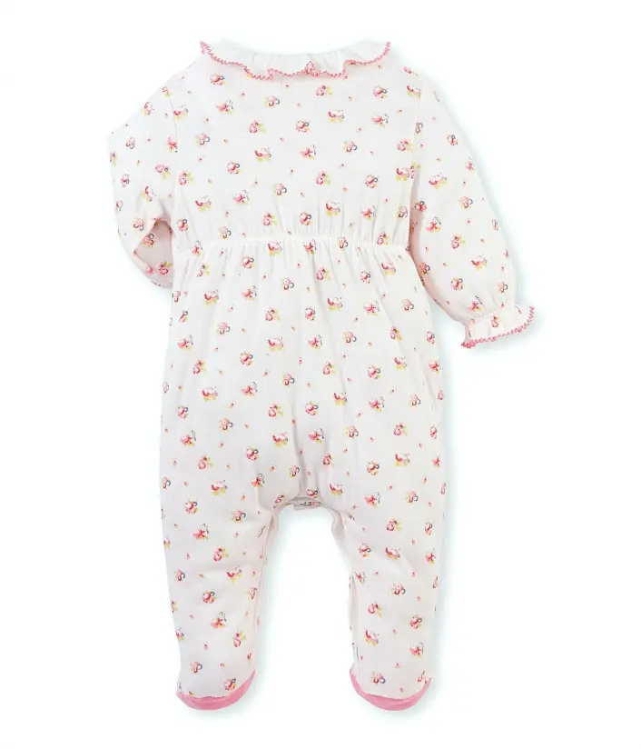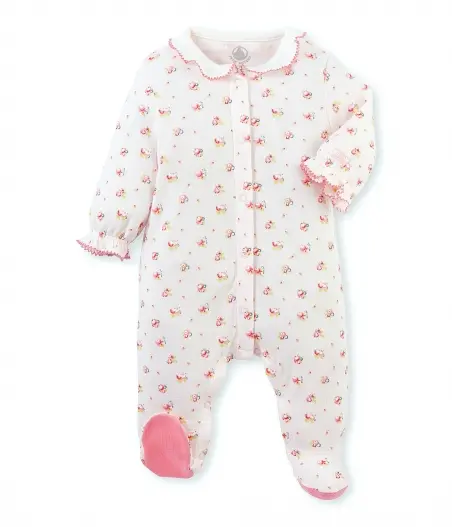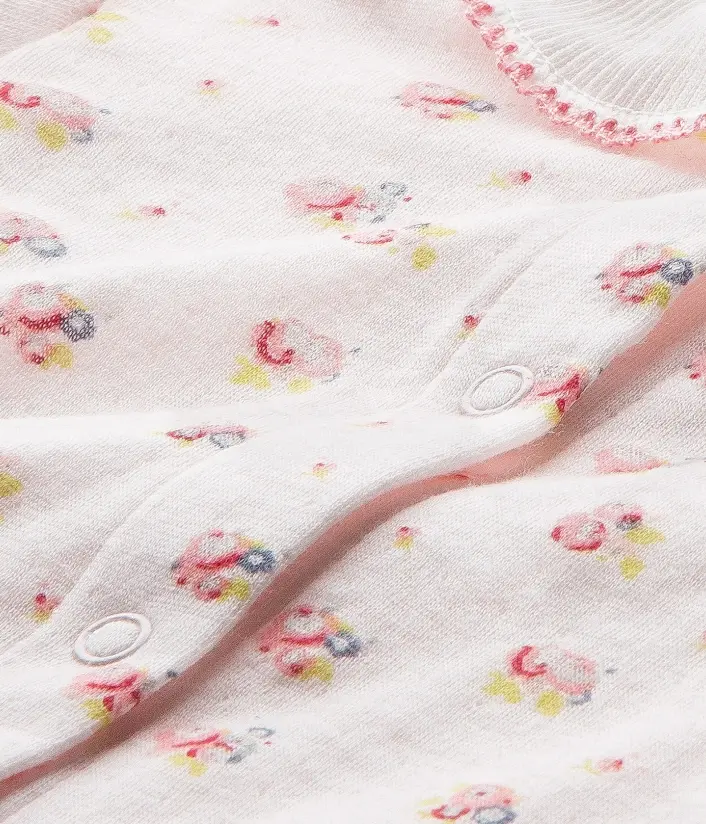 Піжама з закритими ніжками для дівчинки, виготовлена з м'якої тканини з квітковим візерунком. Піжама має застібки впродовж всього виробу, що робить зручним перевдягання немовляти. Маленький хвилястий комірець, зібрана на резинку спинка та хвилясті манжети додають піжамі ще більш дівочого вигляду. Матеріал: 100% бавовна.
