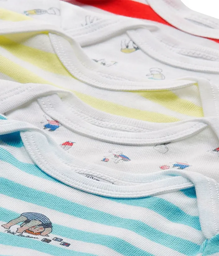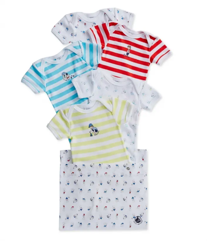 Набір з п'яти боді для хлопчика, представлений у фірмовій бавовняній сумочці-конверті з застібками. Три боді - у смужку, двоє - з малюнком. Матеріал: 100% бавовна.