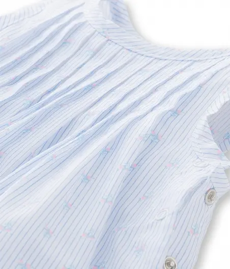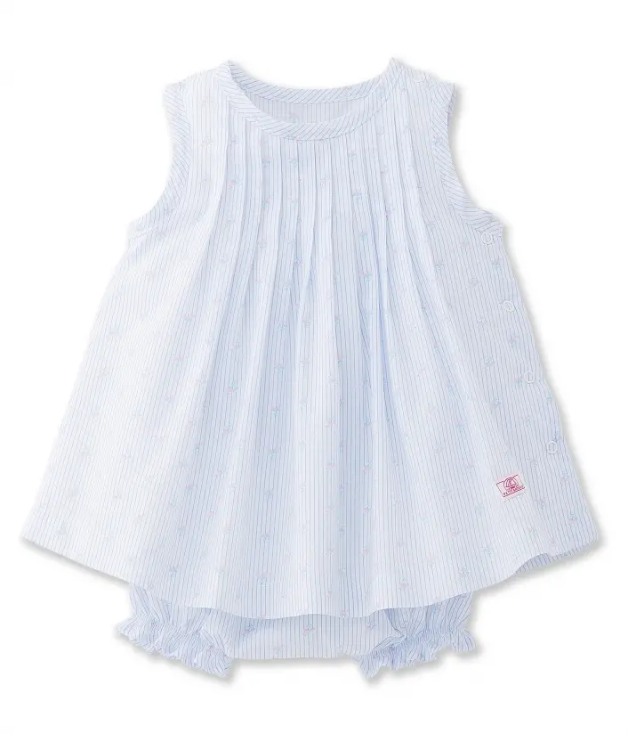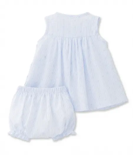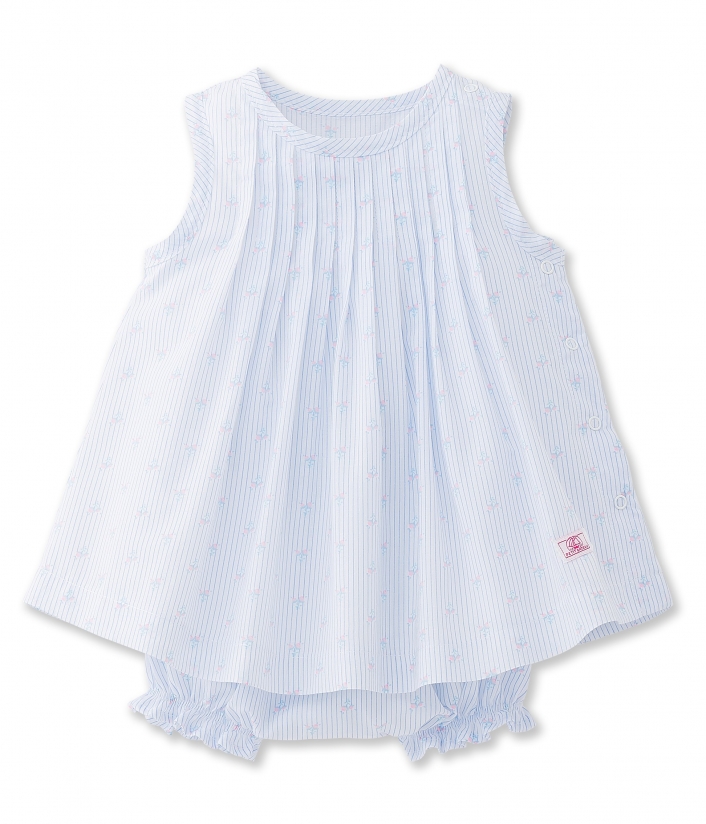Набір сукня з трусиками в дрібну смужку, з квітковим принтом. Сукня має застібку на кнопках. Трусики оздоблені широкою зручною резинкою на талії. Матеріал: 100% бавовна.