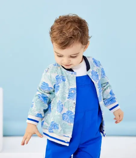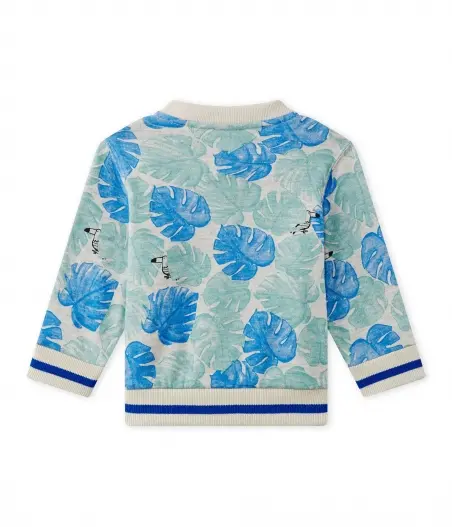 Чарівний трикотажний кардиган з привабливим принтом туканів, що затаїлися в екзотичному пальмовому листі. Зручні застібки на кнопочки полегшують одягання. Склад: 100% бавовна.