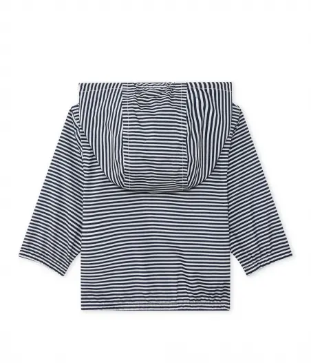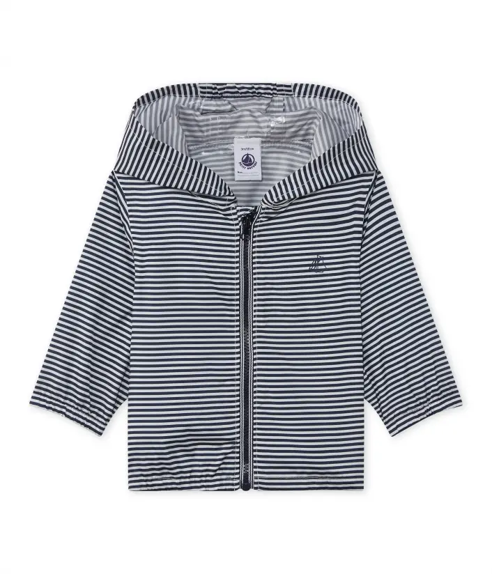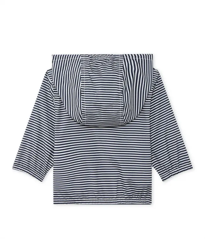 Куртка-вітровка у традиційну смужку Petit Bateau з капюшоном захистить від дощу або вітру. Дизайн куртки пасуватиме під будь-який одяг дитини. Склад: 100% поліестер.