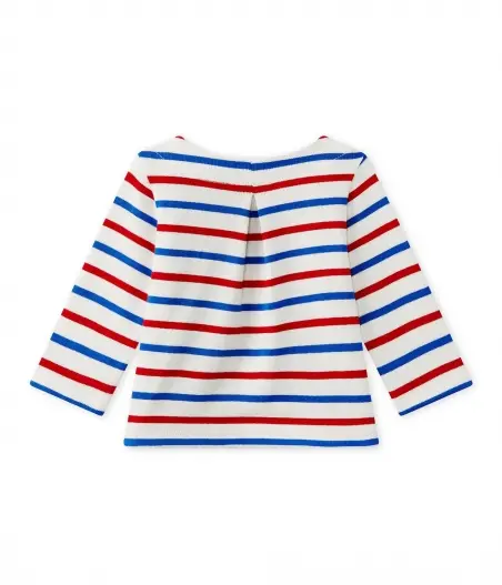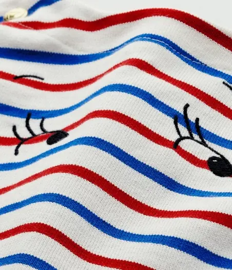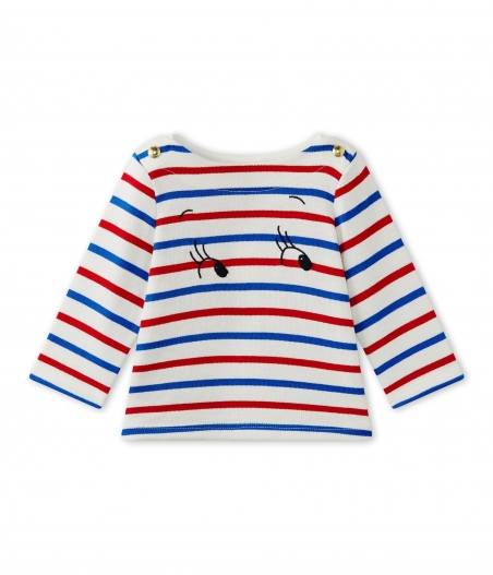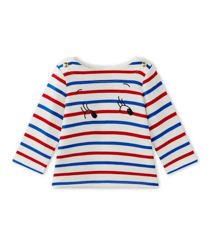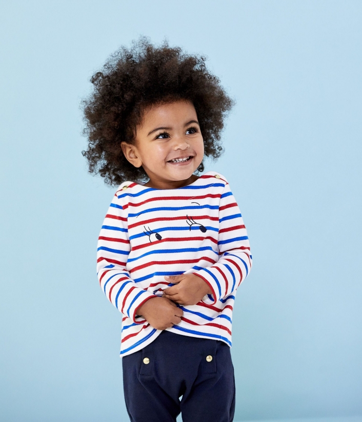 Светр виготовлений з подвійної в'язаної бавовни. Стильні деталі прикрашають светр: цікавий принт, яскраві гудзики золотистого кольору з логотипом Petit Bateau на плечах. Склад: 100% бавовна.