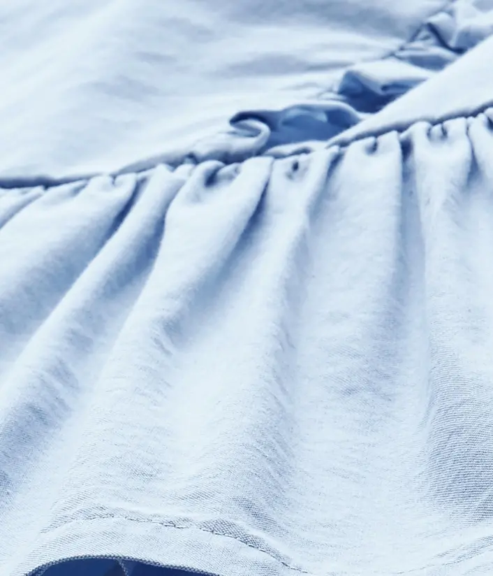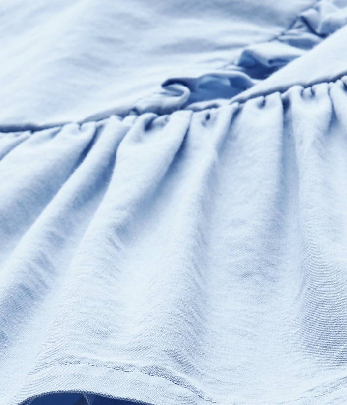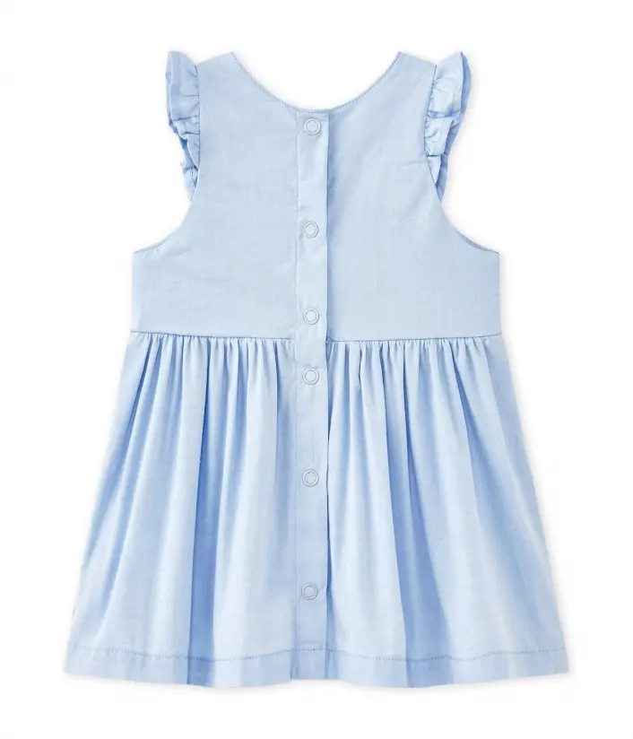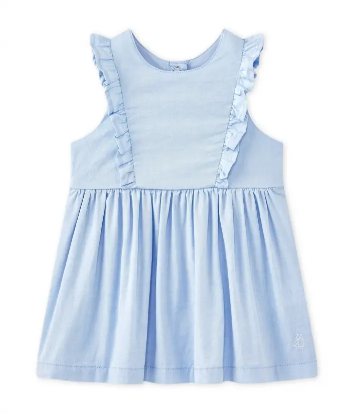 Однотонна літня сукня зі 100% бавовни оздоблена рюшами з обох боків. Низ сукні прикрашений вишивкою традиційного вітрильника Petit Bateau. Морська тематика притаманна виробам Petit Bateau, що робить його таким особливим.