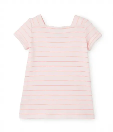 Сукня з короткими рукавами у дрібну смужку для дівчинки. Сукня оздоблена двома кишенями, прикрашена декоративними застібками на плечах. Матеріал: 97% бавовна, 3% поліестер.