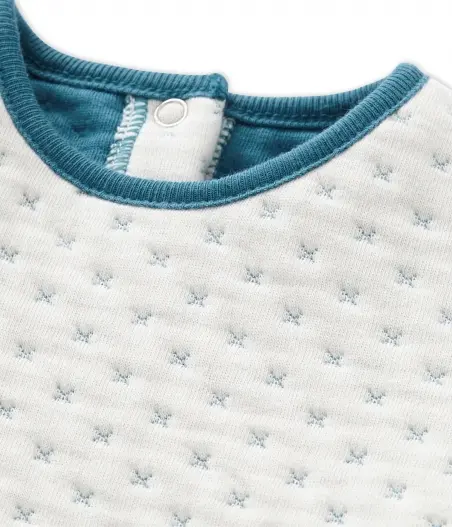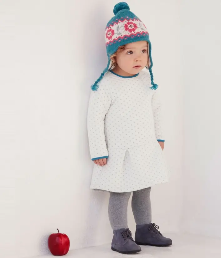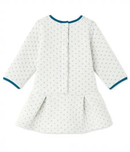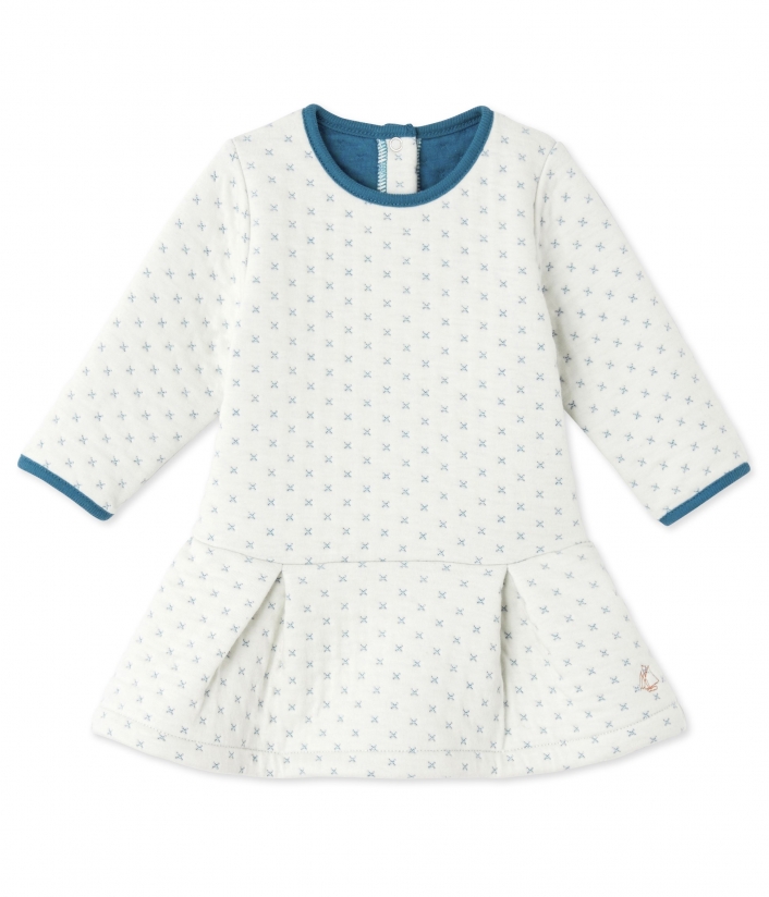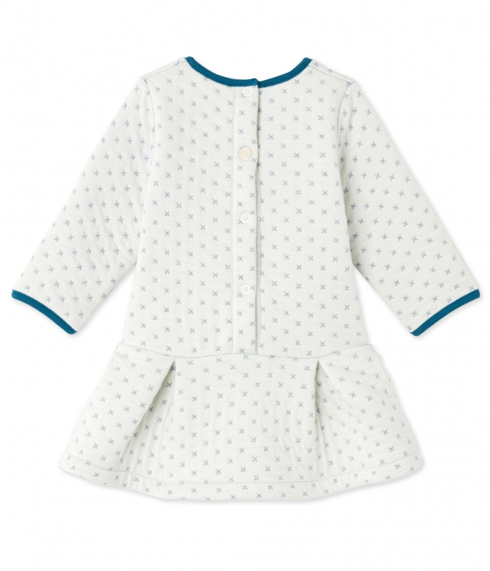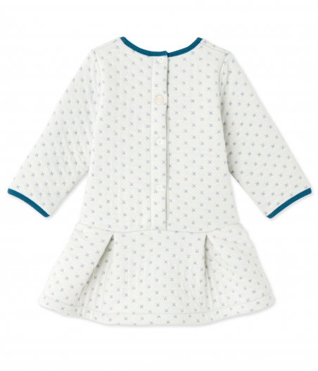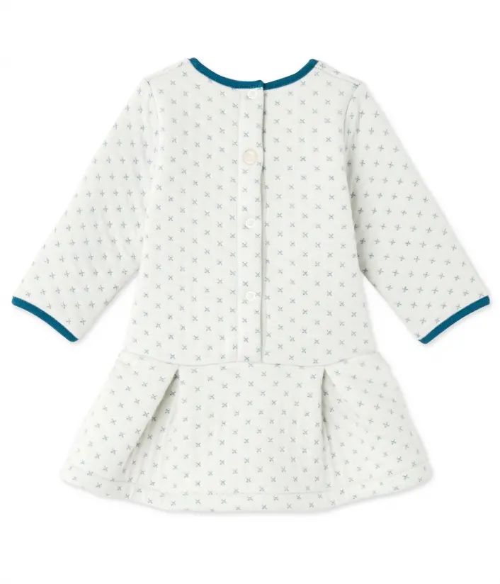 Сукня з довгими рукавами, виготовлена з теплої та м'якої стьобаної тканини. Сукня прикрашена складками на спідниці та оздоблена застібкою на кнопки на спинці. Матеріал: 75% бавовна, 25% поліестер.