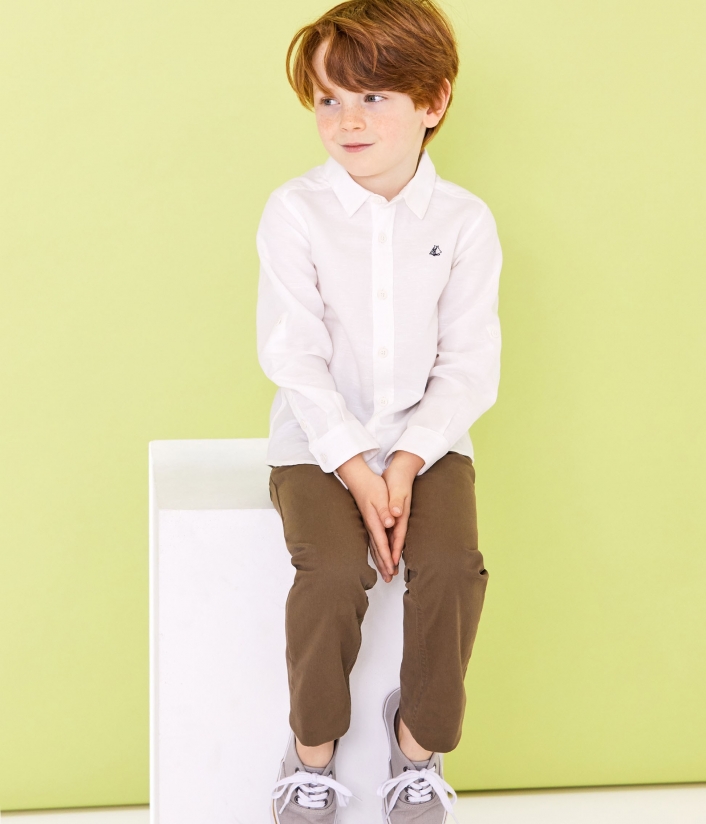 Біла сорочка для хлопчика з традиційним візерунком вітрильника Petit Bateau. Вона пасуватиме до будь-якого одягу. Склад: 100% льон.
