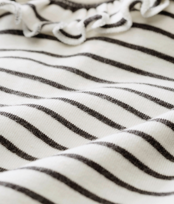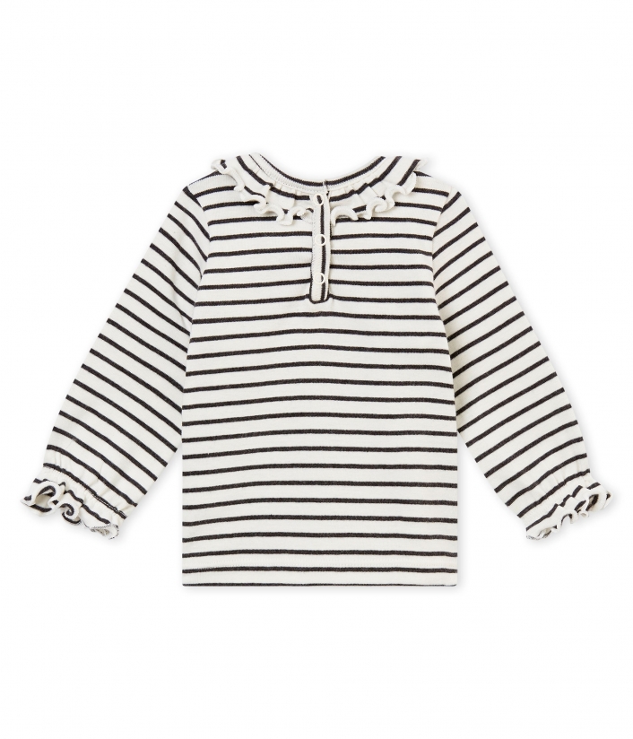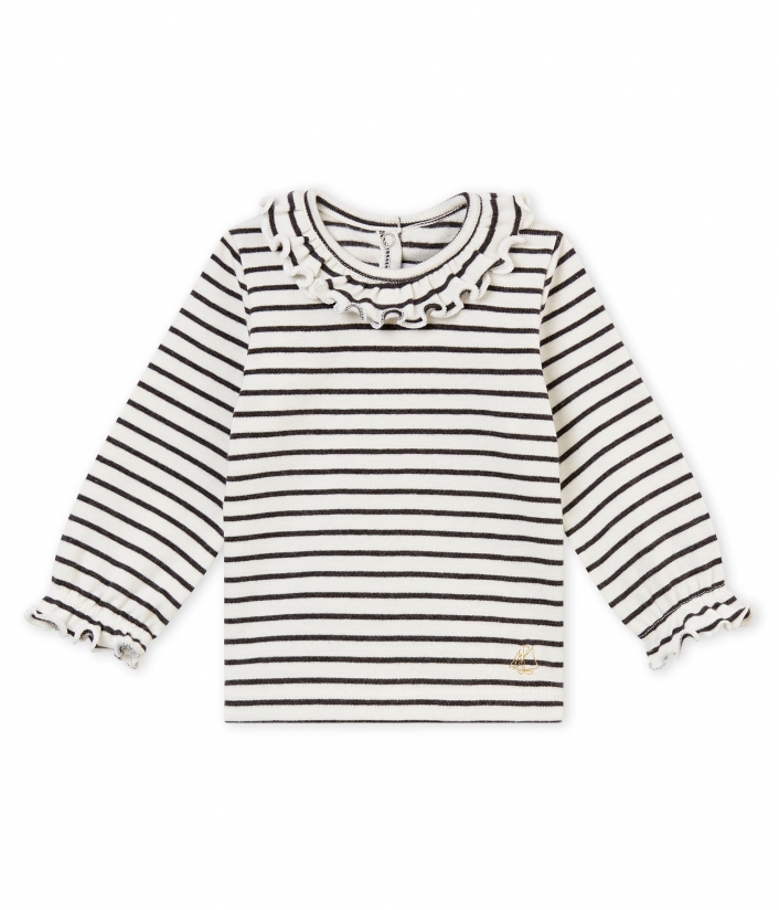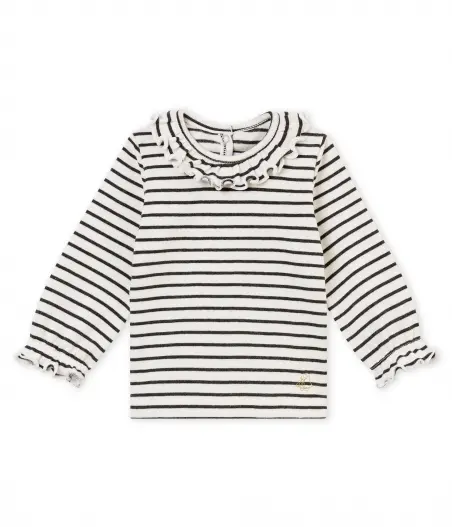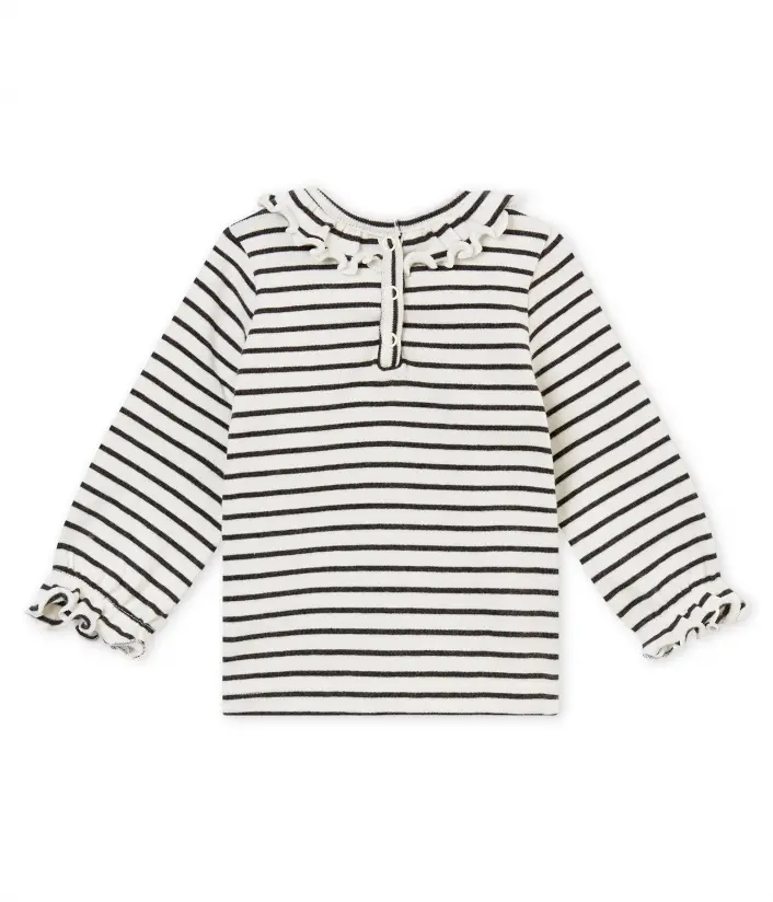 Блузка у трендову смужку з довгим рукавом. Вона оздоблена воланом на комірі та шляркою знизу рукава. Застібка на кнопочки ззаду. Низ виробу прикрашений вишивкою золотистого вітрильника Petit Bateau. Склад: 100% унікальна бавовна
