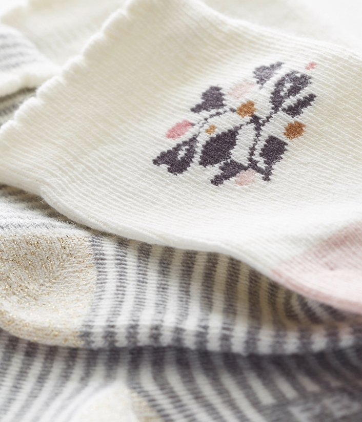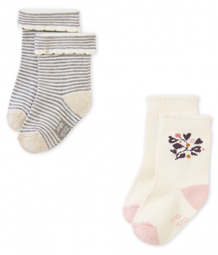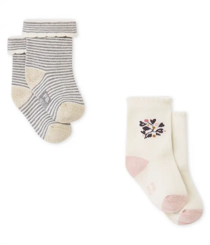 Дві пари милих шкарпеток для малечі, які чудово довершать образ. Вони пошиті з джерсі: одні зі смужками та манжетою, другі - з візерунком на гомілці. Традиційно на ступні має відбиток ініціалів Petit Bateau з певним розміром. Довжина ступні: 15/18 = 7,4-8,3 см; 19/22 = 9,7- 10,6 см; 23/26 = 18,8-14,6 см. Склад: 85% бавовна, 12% поліамід, 2% еластан, 1% поліестер / 87% бавовна, 11% поліамід, 2% еластан