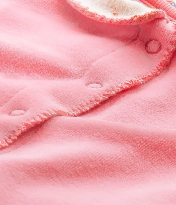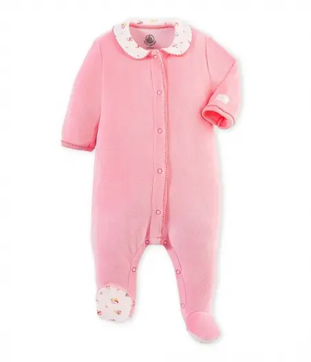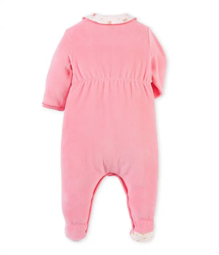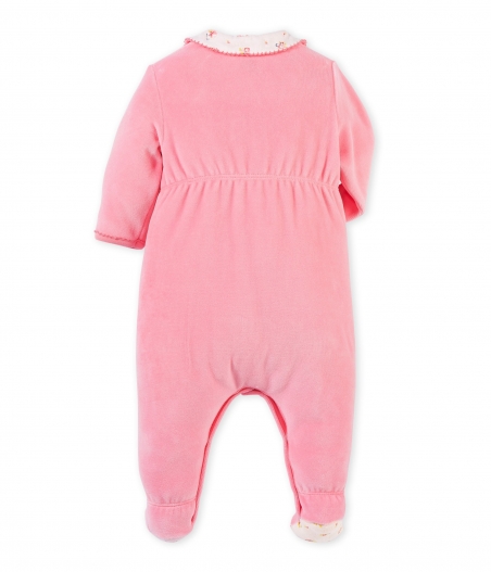 Чарівна піжама з закритими ніжками для дівчинки, виготовлена з м'якого та комфортного велюру. Піжама має дуже зручні застібки, завдяки яким Ви зможете легко вдягнути немовля. Зверніть увагу на деталі: гарний комірець та підошви піжами виконані з тканини з квітковим принтом. Ідеальний подарунок для дівчинки. Матеріал: 80% бавовна, 20% поліестер.