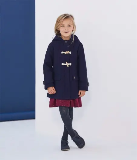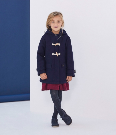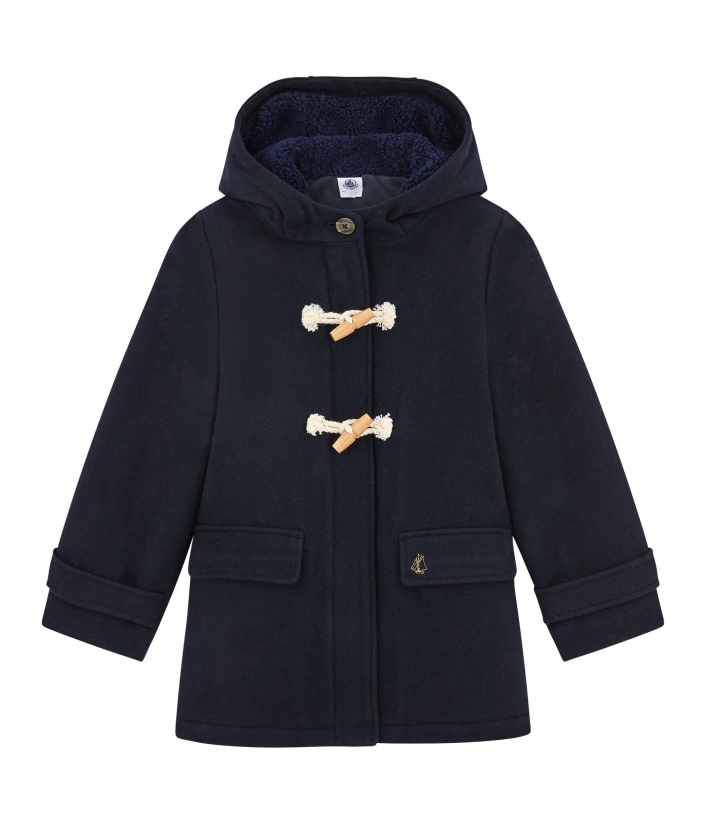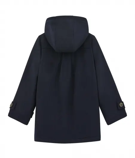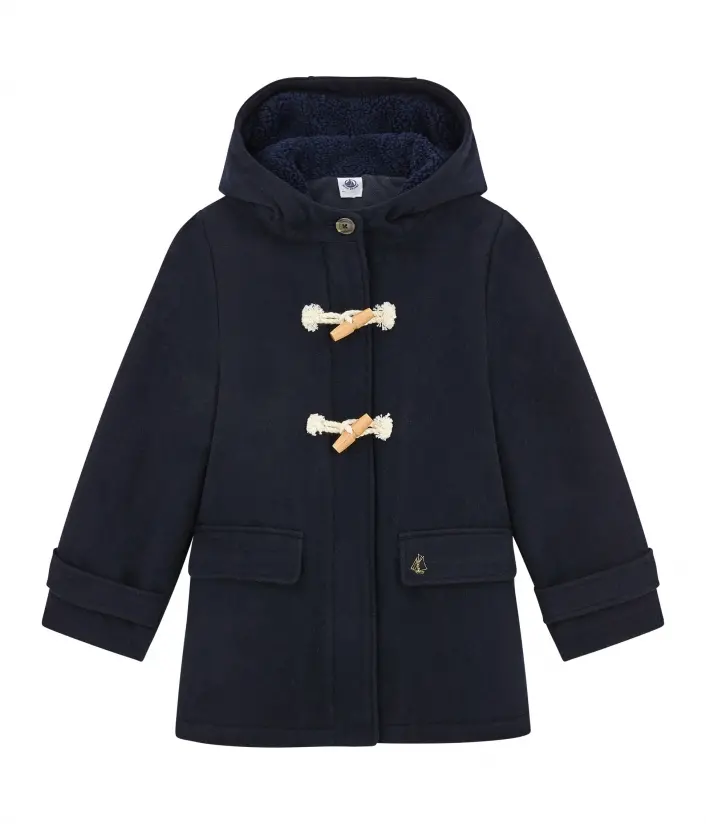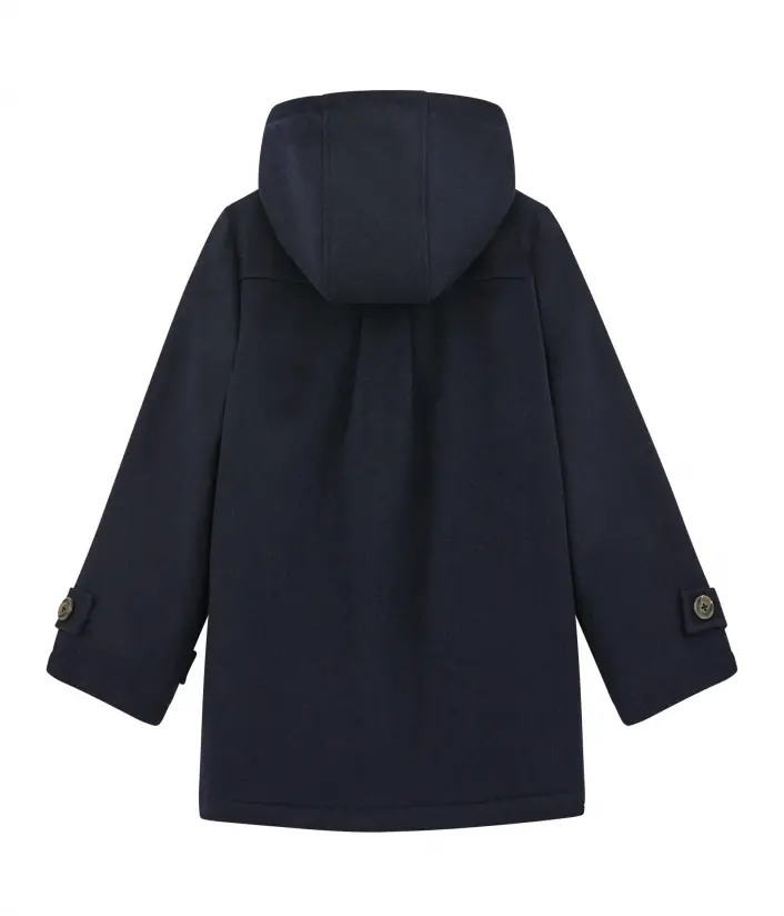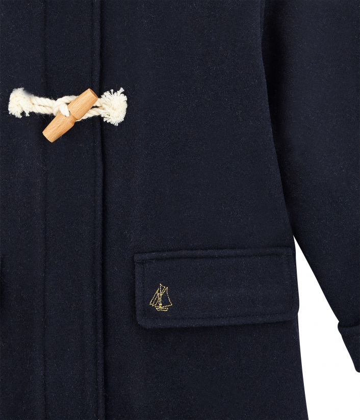 Вовняний дафлкот з капюшоном спортивного стилю, прямого силуету з центральною застібкою-блискавкою та ґудзиками-паличками. Великі накладні кишені спереду з вишитим вітрильником Petit Bateau. Дафлкот виготовлений з цупкої вовняної тканини темно-синього кольору. Склад: 80% вовна, 20% поліамід/ 100% поліестер, 100% поліамід