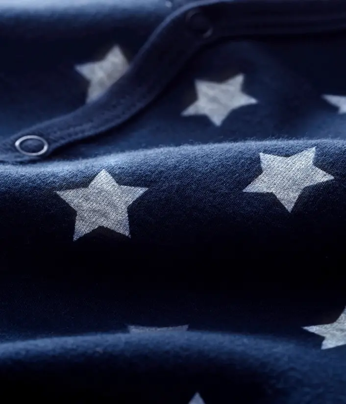 Піжама прикрашена зірочками. Застібки на кнопочки для зручнішого перевдягання. OEKO-TEX® гарантує безпечність для шкіри. Склад: 100% унікальна бавовна