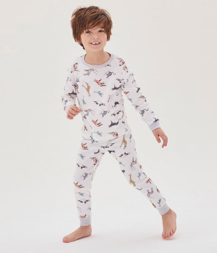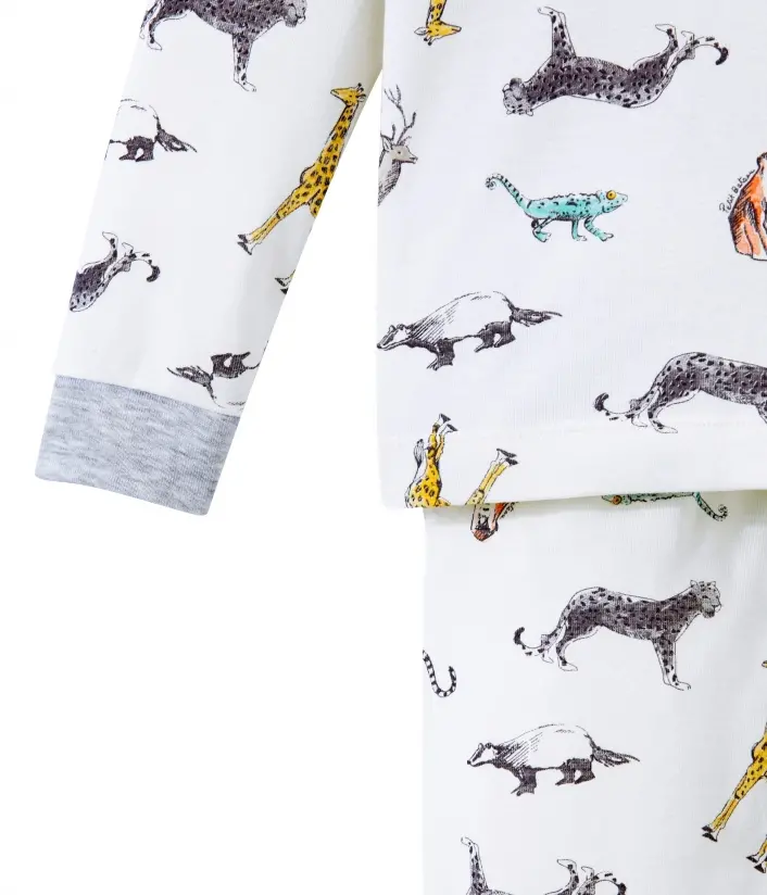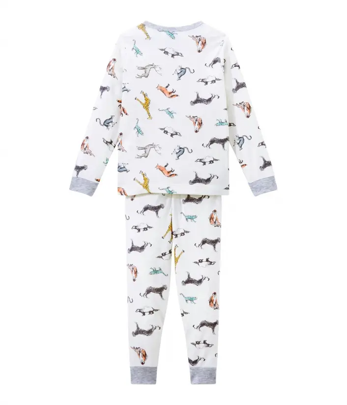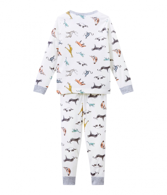 Однотонная теплая пижама молочного цвета с принтом различных зверюшек. Контрастная горловина придает особый шарм пижаме. Рукава футболки и брюки с манжетами серого цвета. Отличный выбор для комфортного сна. OEKO-TEX® гарантирует безопасность для кожи. Состав: 100% уникальный хлопок