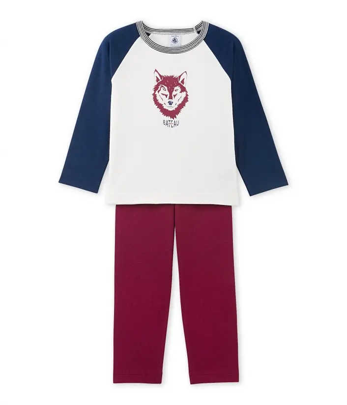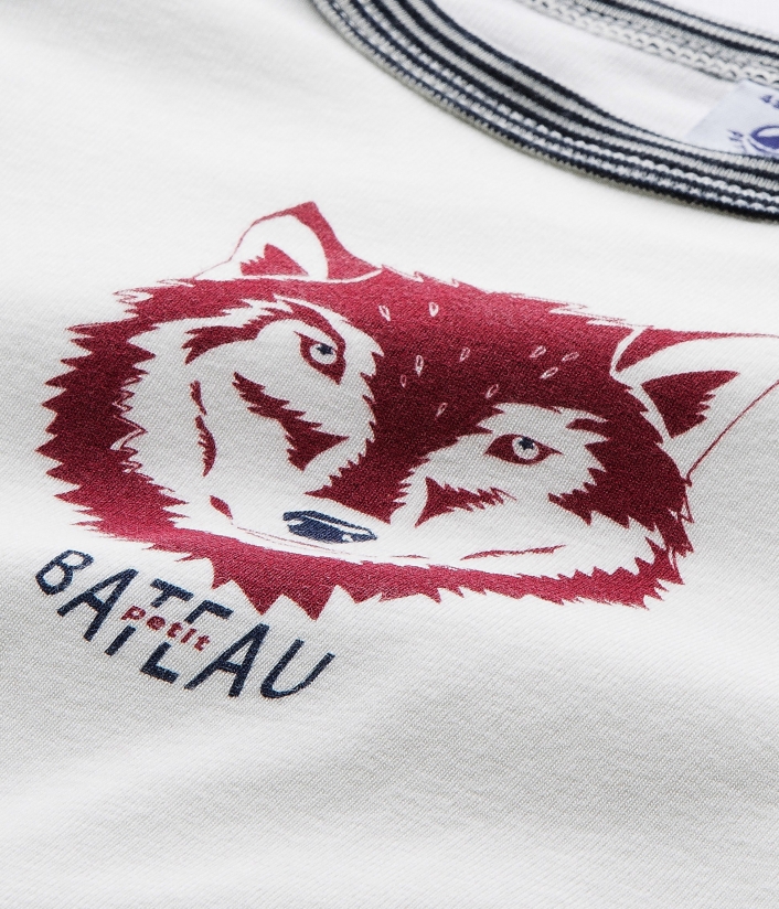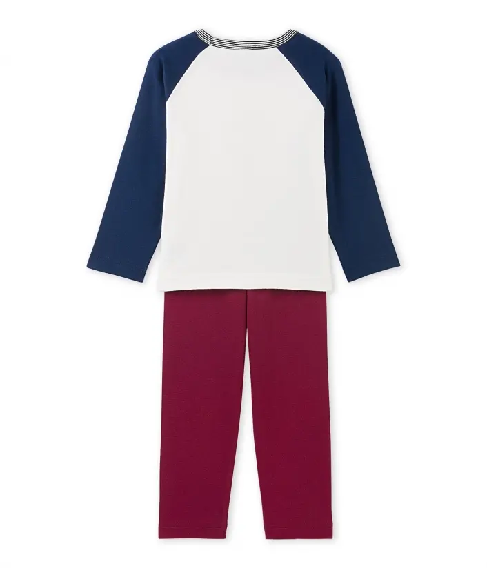 Разноцветная пижама для мальчика, украшена крупным рисунком на груди. Вырез отделан тканью в мелкую полоску. Материал: 100% хлопок.