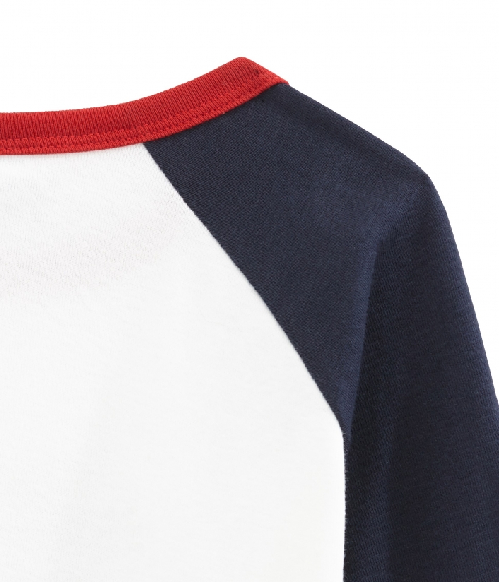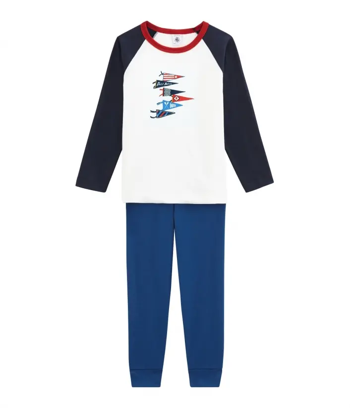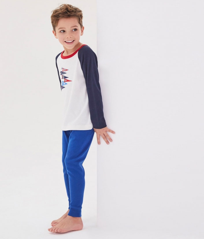Теплая пижама для комфортного сна. Футболка с контрастной горловиной красного цвета и принтом флагов Petit Bateau. Однотонные брюки голубого цвета с манжетами. OEKO-TEX® гарантирует безопасность для кожи. Состав: 100% уникальный хлопок