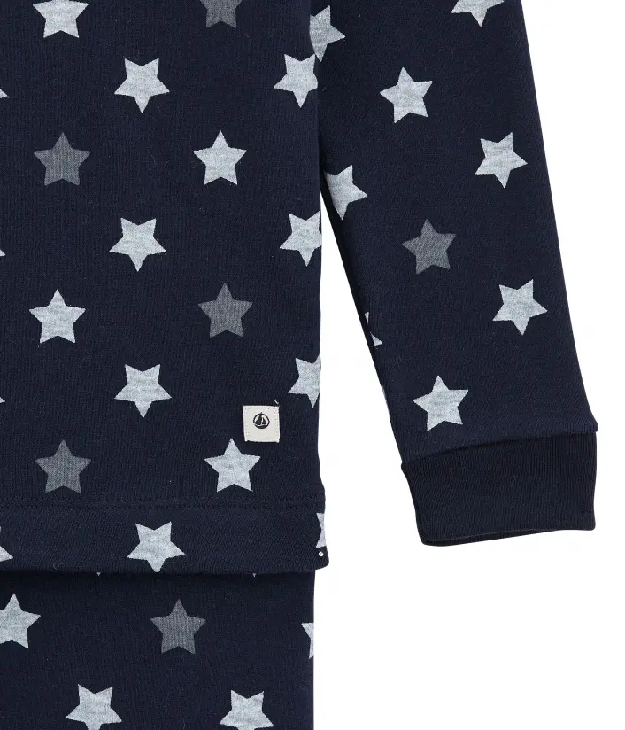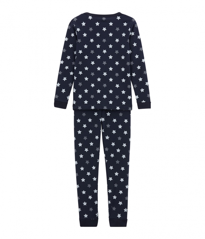 Однотонная теплая пижама цвета индиго украшена разноцветными звездочками. Рукава футболки и брюки с манжетами. Отличный выбор для комфортного сна. OEKO-TEX® гарантирует безопасность для кожи. Состав: 100% уникальный хлопок