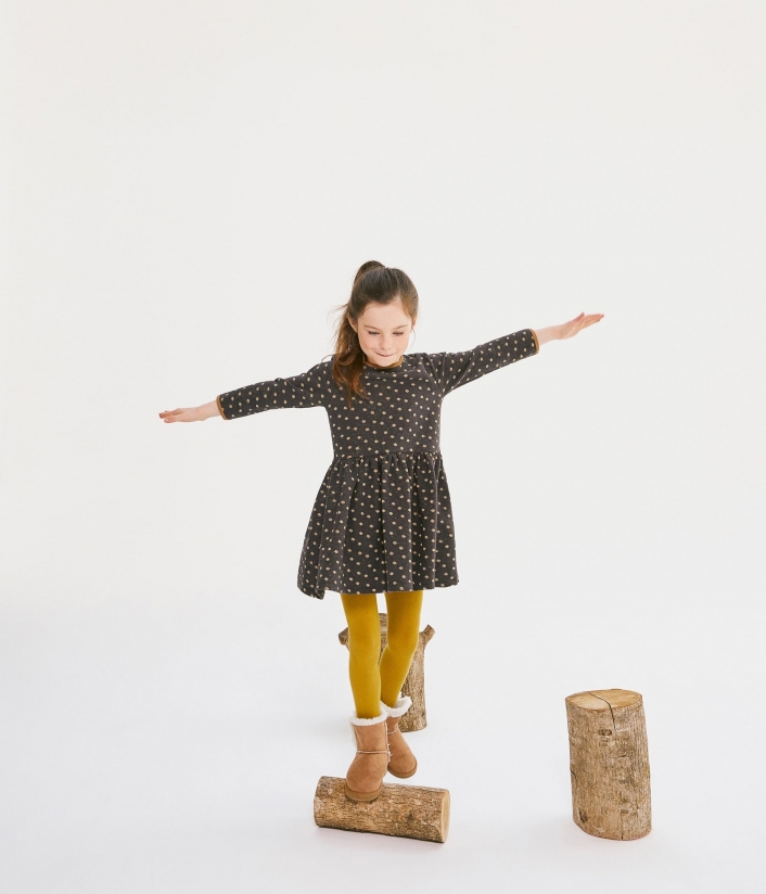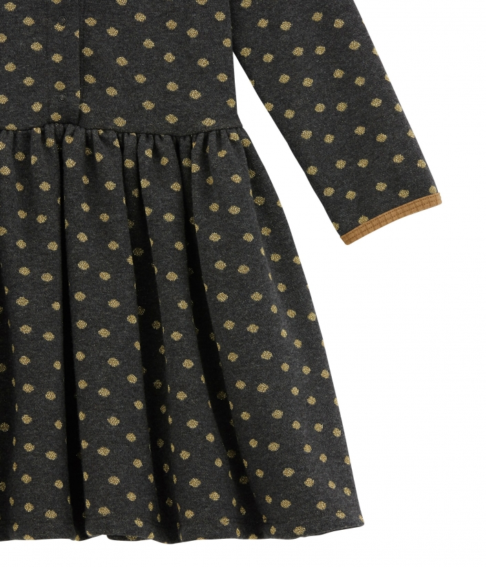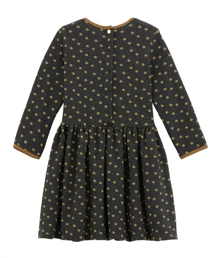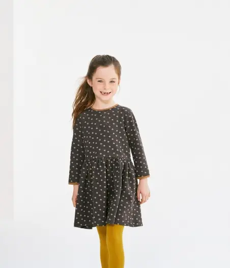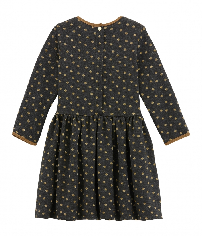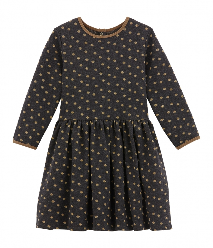 Чарівна сукня в золотистий горошок, без сумніву, сподобається дівчинці. Чудово підійде для повсякденного одягу. Пошита з інтерлоку (особливий вид подвійного трикотажу), який відрізняється м'якістю та гладкістю. Контрастна окантовка сукні виділяє усі її переваги. Застібка на золотисту кнопочку з логотипом Petit Bateau полегшить перевдягання. Склад: 86% бавовна, 7% поліамід, 7% поліестер