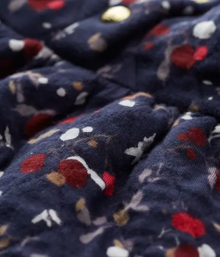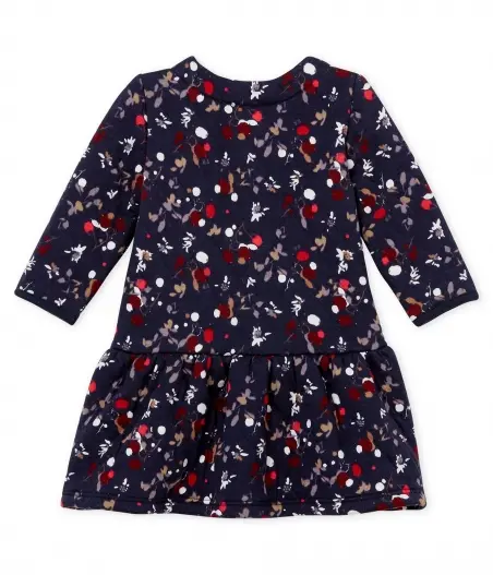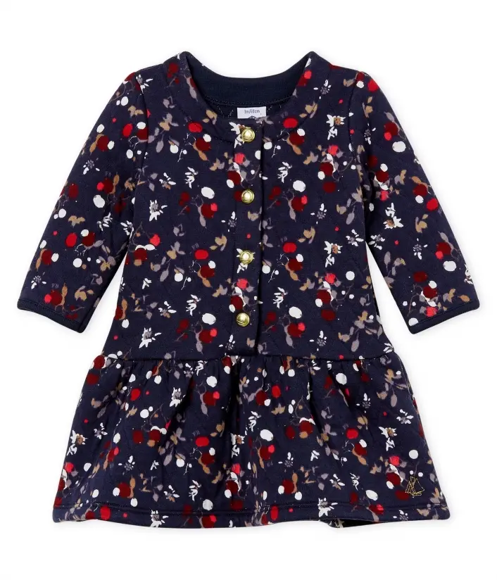 Чудовий вибір для одягання восени - комфортна та елегантна сукня з коміром типа "Пітер Пен", пишною спідницею із складками та заниженою талією. Квітковий принт додає особливого шарму сукні. Щільна бавовна надає тепла. Золотисті ґудзики з емблемою Petit Bateau полегшують перевдягання. Склад: бавовна, поліестер