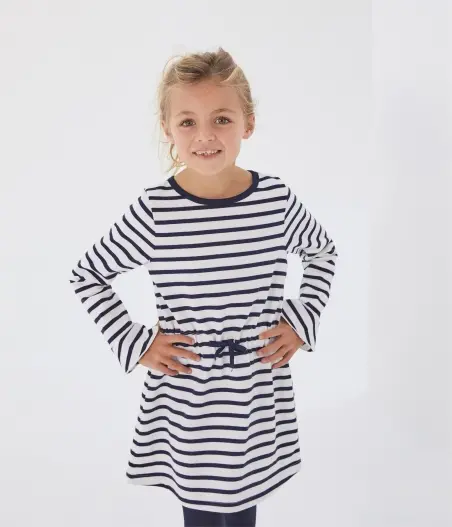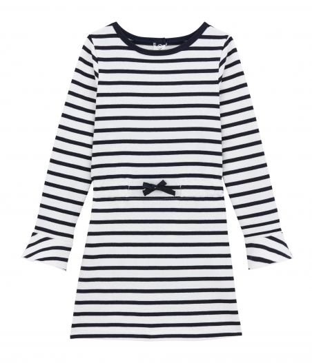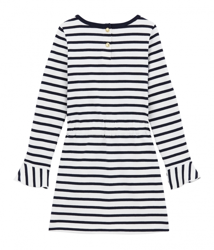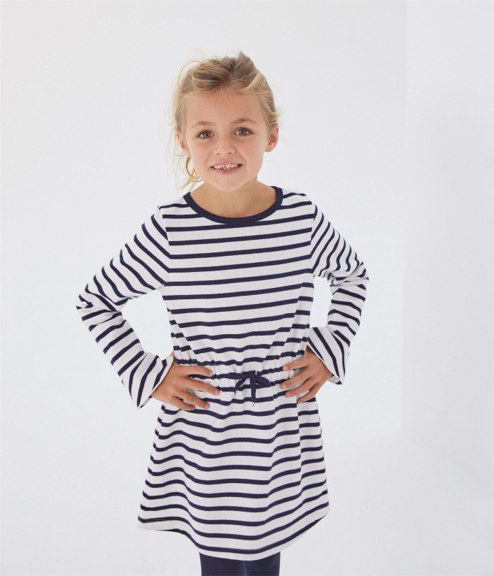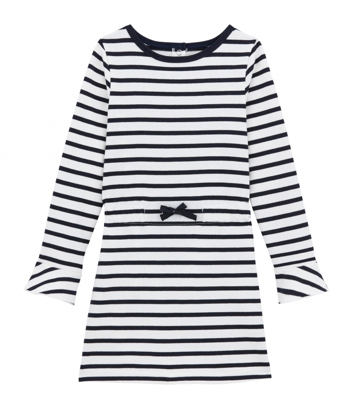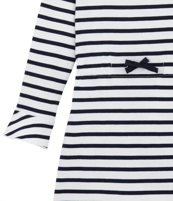 Ця мила сукня для дівчинки здатна надати сонячного настрою взимку. Дизайн виповнений у морському стилі. Традиційні смужки Petit Bateau прикрашають сукню, а чарівні деталі (контрастна окантовка горловини, зав'язки на талії та розширені рукава) роблять її унікальною, легкою та сонячною. Застібається на кнопочки ззаду. Підходить для повсякденного одягу. Склад: 100% унікальна бавовна