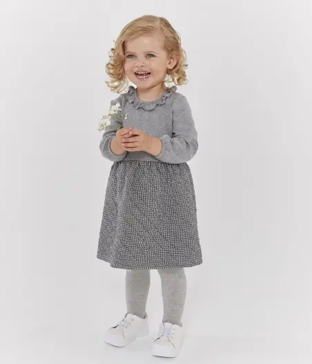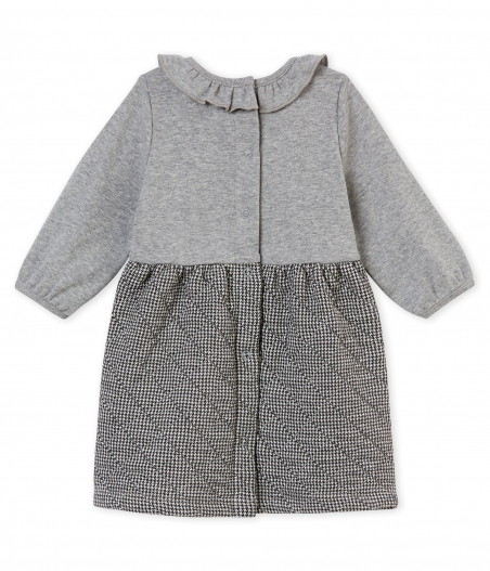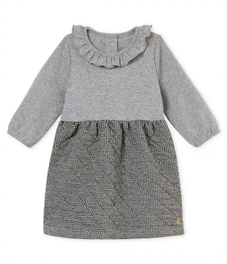 Тепла та стильна сукня з коміром та манжетами. Спідниця сукні трохи розширена до низу. Ззаду по всій довжині виробу застібки на кнопочки. Вишивка золотистого вітрильника Petit Bateau знизу сукні чудово доповняє її. Склад: 100% бавовна/88% бавовна, 12% поліетилен