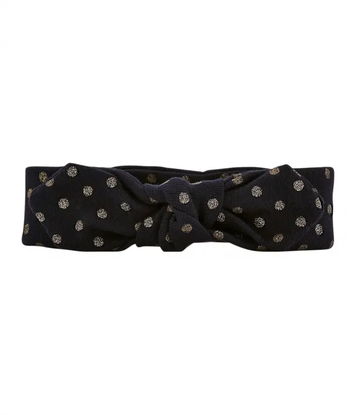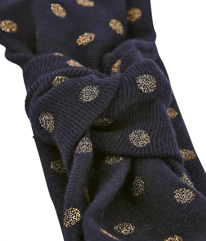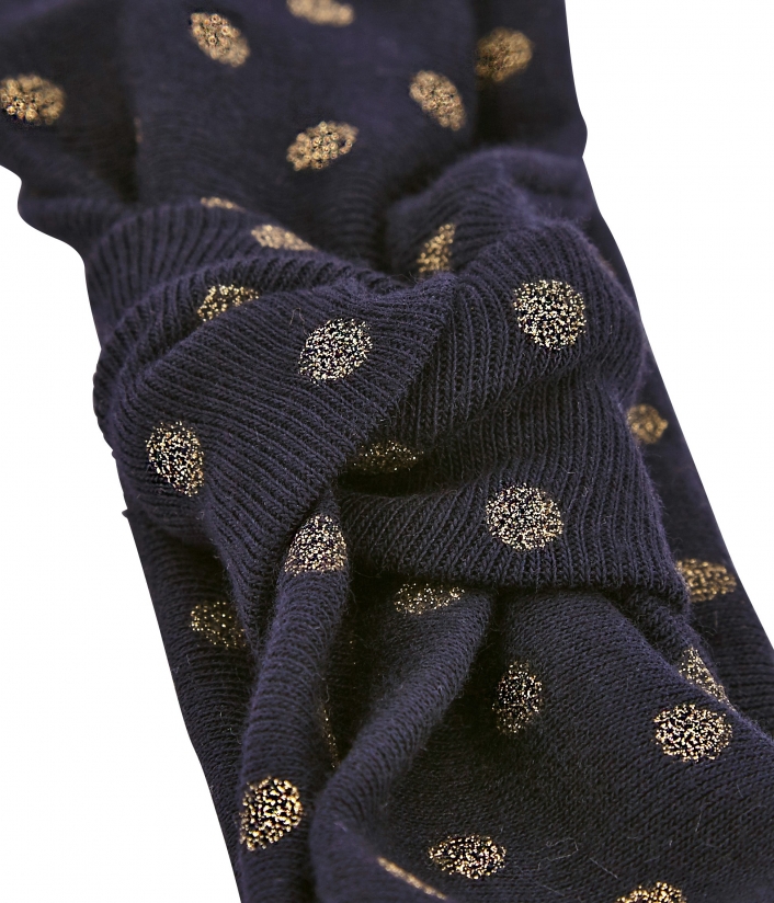 Трикотажна пов'язка трендового кольору (індиго) у золотистий горошок. Чудовий аксесуар для волосся пасуватиме під будь-який образ дівчинки. Склад: 100% бавовна