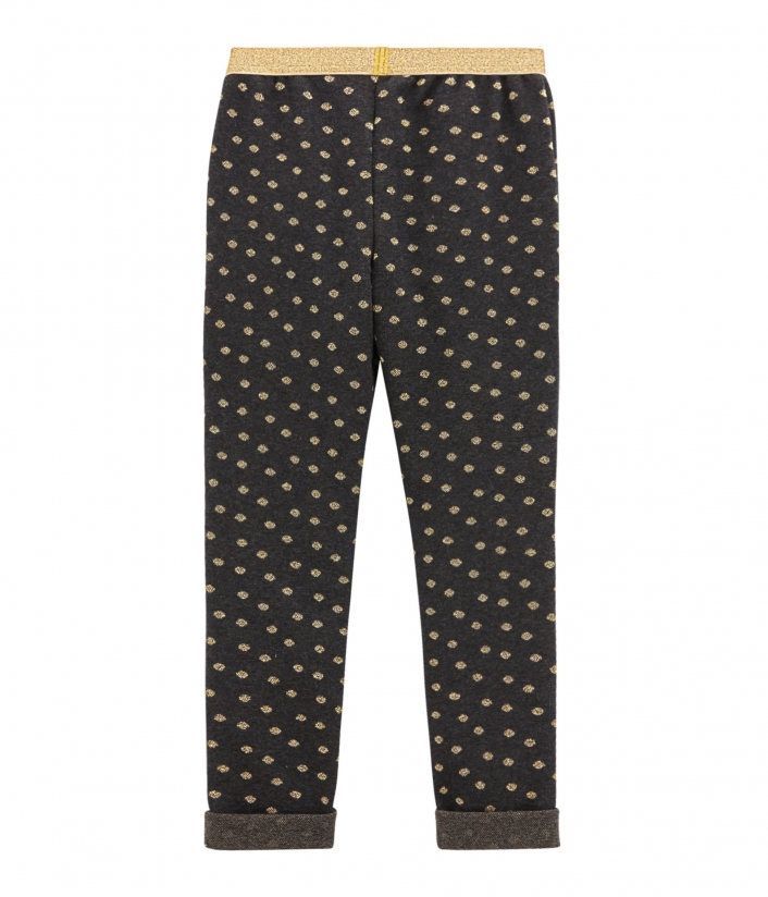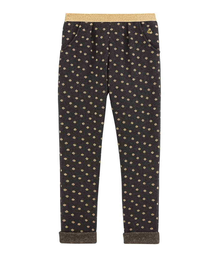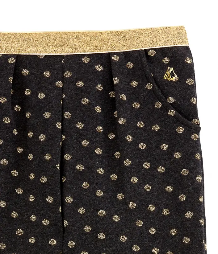 Брюки у золотистий горошок з кишенями надзвичайно зручні. Пошиті з інтерлоку (особливий вид подвійного трикотажу), який відрізняється м'якістю та гладкістю. Еластичний пояс в золотистому оздобленні виглядає шикарно. Штани підвернуті знизу. Золотистий вітрильник Petit Bateau являється знаковим. Склад: 86% бавовна, 7% поліамід, 7% поліестер