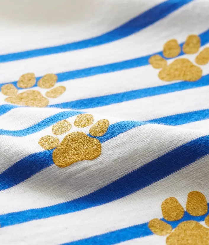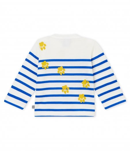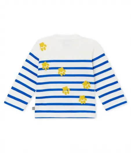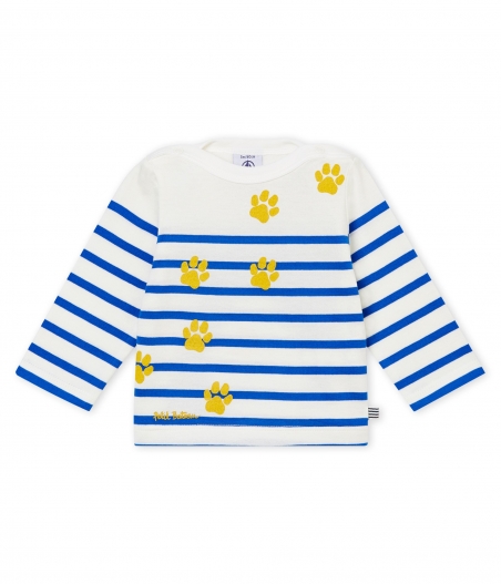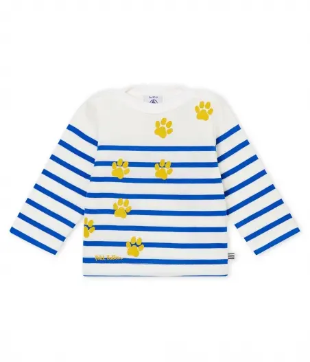 Petit Bateau змінив дизайн цього сезону. Тепер традиційна смужка поєднана з цікавим принтом . Одяг Petit Bateau сповнений креативом. Будьте не схожими на інших - одягайтеся в Petit Bateau. Футболка пошита з м'якого джерсі. Її прикрашають блакитні смужки та принт слідів лапки ведмедя. Склад: 100% бавовна