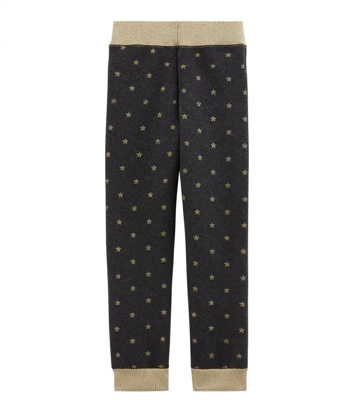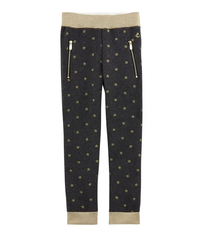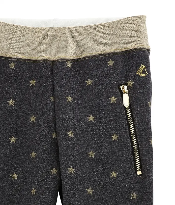 Трикотажні брюки у золотисті зірочки з кишенями із застібкою-блискавкою. Пошиті з екстра теплого трикотажу. Золотистий вітрильник Petit Bateau являється знаковим. Еластичний пояс та манжети на брюках в золотистому оздобленні виглядають шикарно. Склад: 100% бавовна/ 49% бавовна, 31% віскоза, 17% поліетилен, 3% еластан
