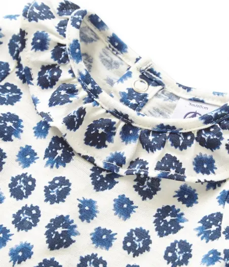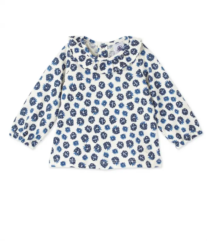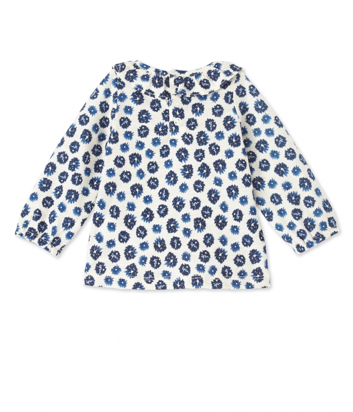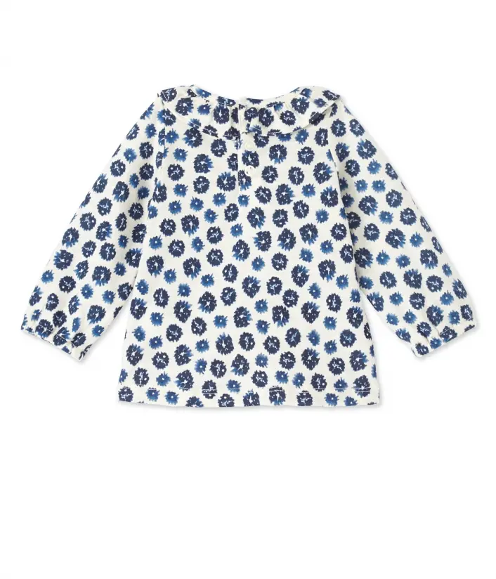 Простора блуза з довгими рукавами для дівчинки, прикрашена квітковим принтом. Блуза має зручні застібки на спині для комфортного переодягання Вашої дитини. Виріз блузи оздоблений оборкою. Матеріал: 100% бавовна.