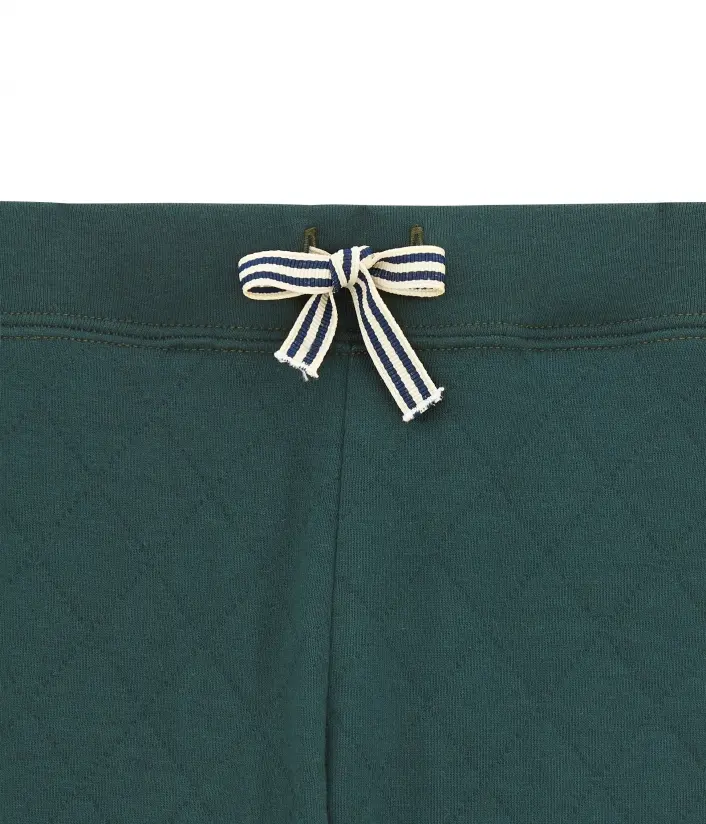 Брюки з подвійної трикотажної в'язки зігріють взимку. Еластичний пояс на смугастій зав'язці, кишені по боках та одна позаду, манжети на брюках. Знаковим є вишивка вітрильника Petit Bateau. Склад: 92% бавовна, 8% поліестер